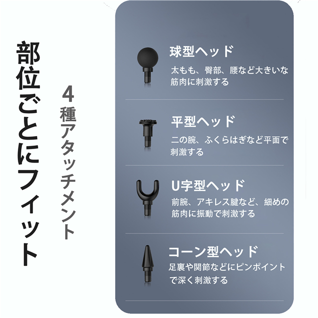 ■セット内容:マッサージガン本体、充電ケーブル、4つマッサージヘッド