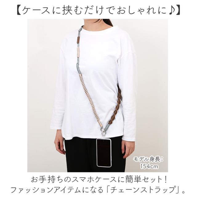 | 商品説明 | 【ケースに挟むだけでおしゃれに♪】 ・お手持ちのスマホケースに簡単セット!ファッションアイテムになる「チェーンストラップ」。 【スマホが迷子にならずいつも一緒】 ・スマホを斜め掛けして持ち歩き♪サッと手に取りやすく、ポケットのない洋服でも大丈夫。 【挟んでストラップをサクッと装着】 ・付属のクリアホルダーをスマホケースにセット。ストラップもナスカン式で着脱簡単。 (※1)ケーブル穴の幅が1.3cm以上のケースに使用可能、ケースの形状によっては使用できない場合もあります。 【スマホの機種を問わず使える】 ・お手持ちのスマホケースに取り付けるタイプなので、スマホを買い替えても使用可能。 (※2)ストラップホール付きのケースをお持ちの場合、クリアホルダーを外して直接取り付けも可能です。取り付けリングは太めなので、ご注意ください。 【両手が空いてストレスフリー】 ・動きやすく、色んなシーンで重宝。スマホの落下や、置き忘れ防止にも役立つアイテム! 【シンプルながら程よいアクセントに】 ・色味の異なるロープを編み込み。コーデを選ばず、ポイント使いにも☆ |