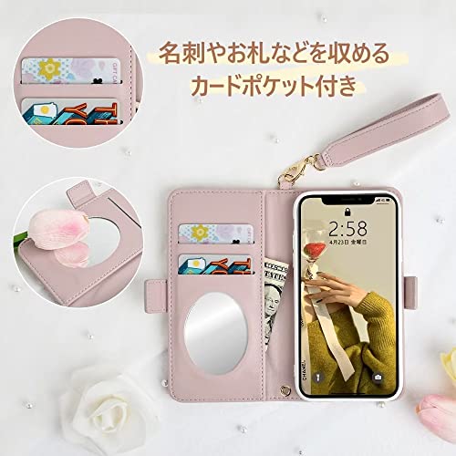 多彩な機能性スマホケースの内側にはカードポケット2つとサイドポケット1つ付き,交通系カード、クレジットカード、レシート、お札などが収納できます。メイク直しミラー付き。外出先でお化粧直しや身だしなみチェックできる便利なアイテムです。