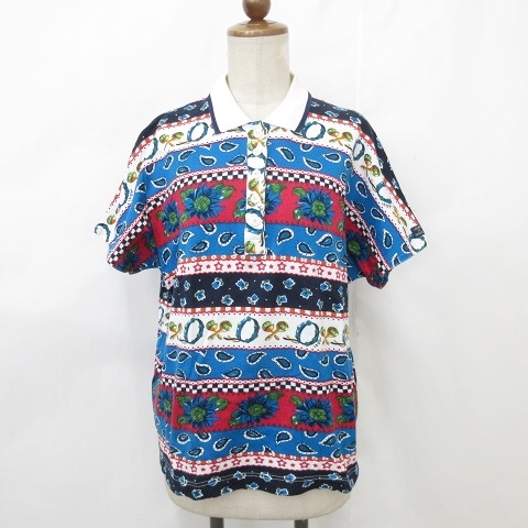 【中古】トピィーズ Topys カットソー Tシャツ 半袖 ボーダー 総柄 綿 青 白 紺 ブルー ホワイト ネイビー レディース