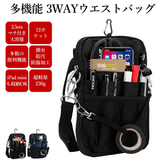 多機能 ウエストポーチ ナースポーチ ウエストバッグ オーガナイザー マチ2.5cm レギュラータイプ シングルジッパー仕様 3way ショルダー 文具 工具バッグ 小物入れ 仕事用 作業用 業務用 看護 介護 事務 ウエストベルト・ショルダーベルト付き 撥水 防傷 12ポケット Mサイズ
