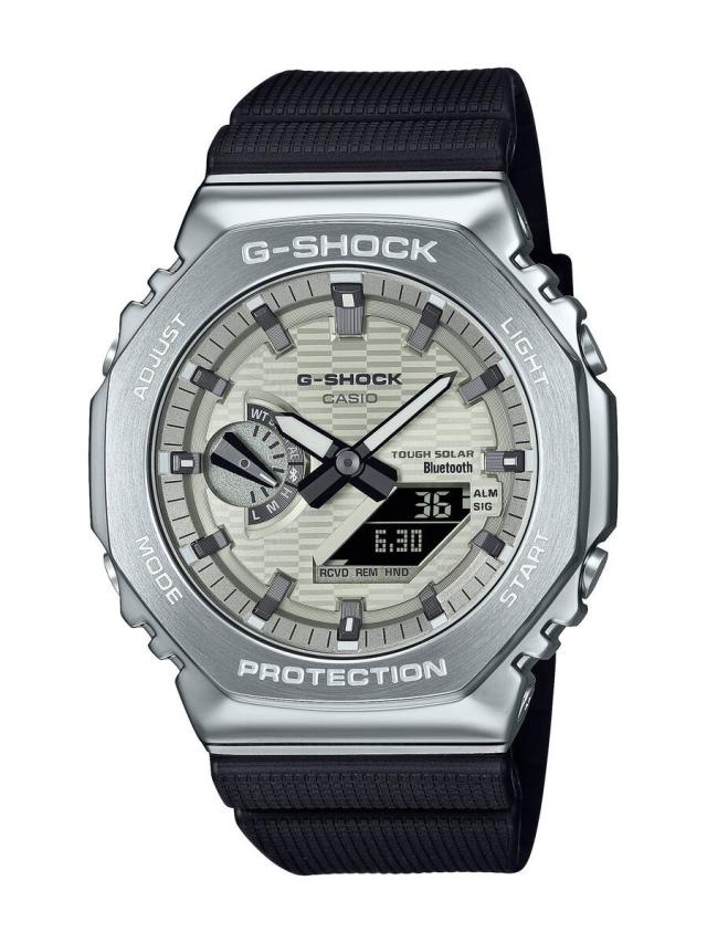 1983年の発売以来、飽くなき強さを求めて進化を続けるタフネスウオッチG−SHOCKから、2100シリーズの特徴であるスリムなサイズ感をキープしながら、スマートフォンリンクとタフソーラーを搭載したメタルベゼルのモデルです。