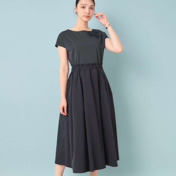 一枚で簡単に決まるカットソーと布帛の異素材切替えワンピース。
