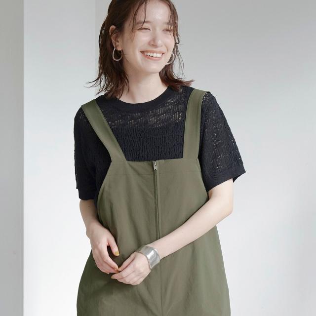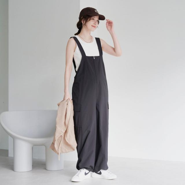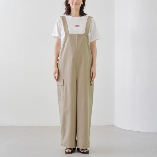 フロントジップがアクセントになった、大人カジュアルなジップサロペット。