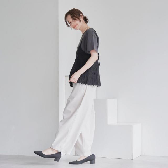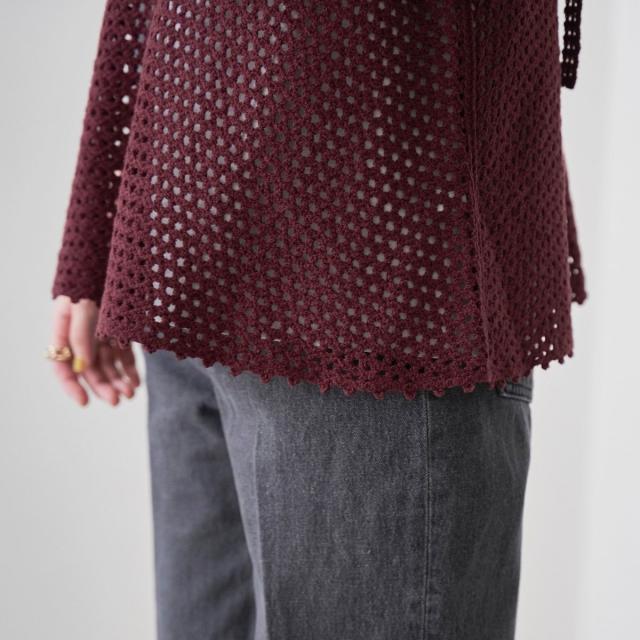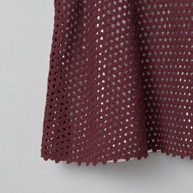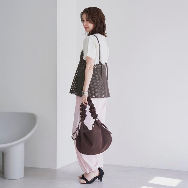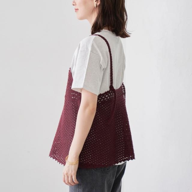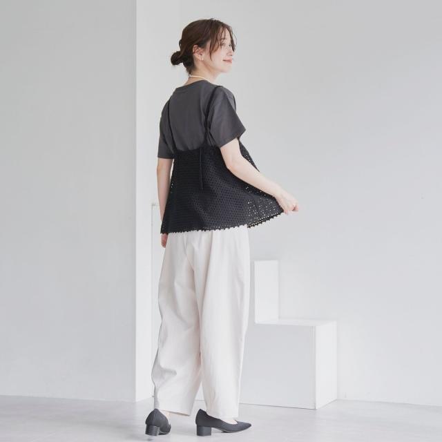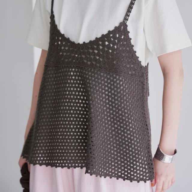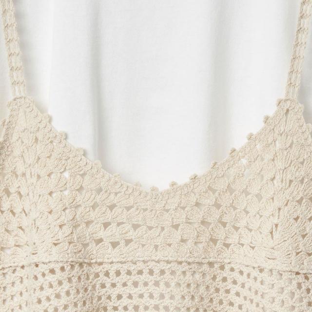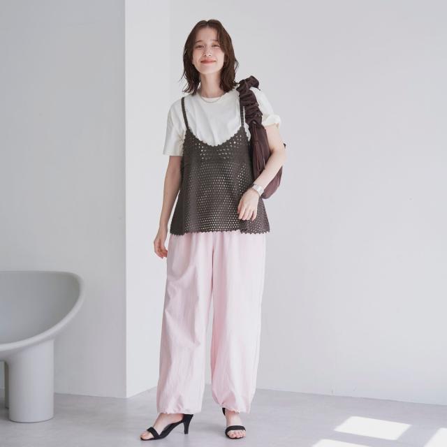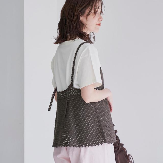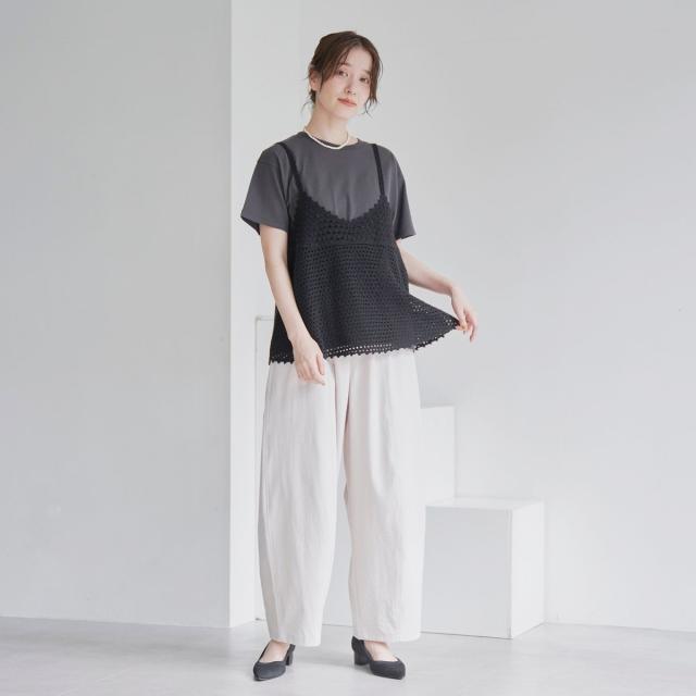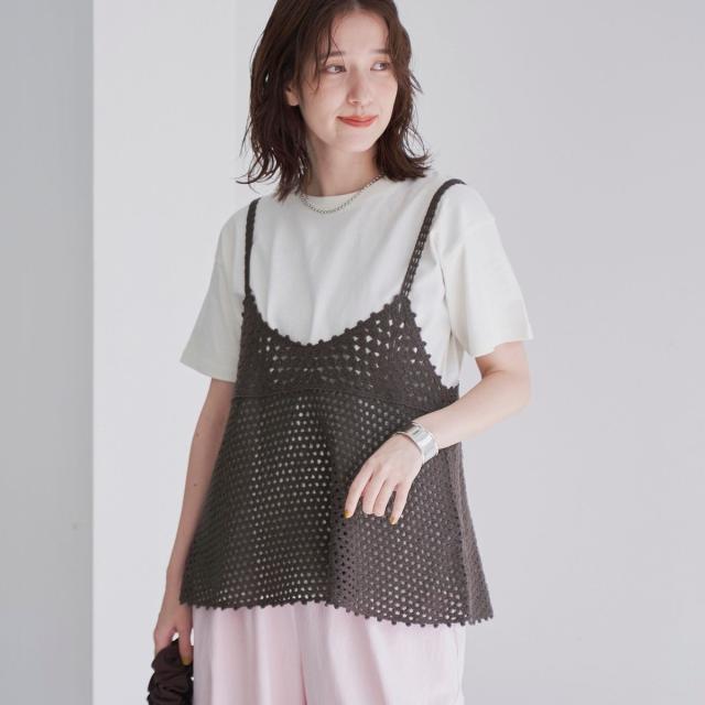 キャミは繊細な編み目が魅力のクロシェ編みで、レイヤードするだけでトレンド感のあるスタイリングに。