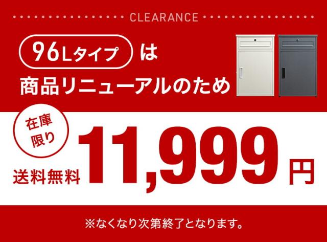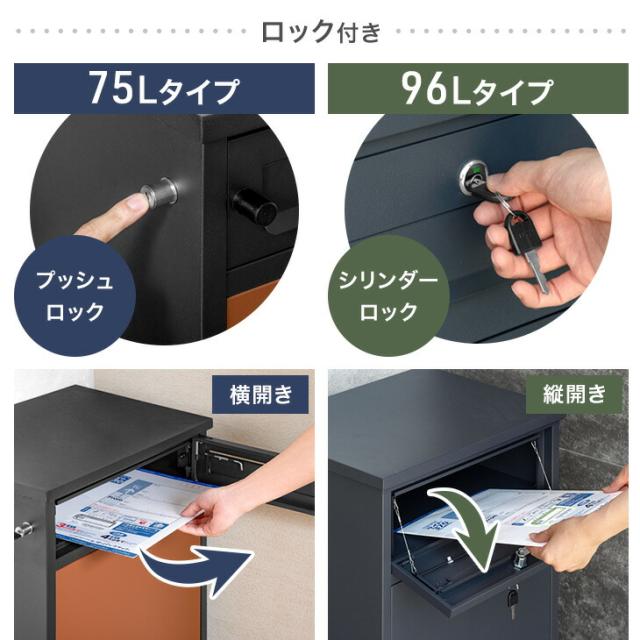 ![]() 105L 専用キー付き | ![]() 大容量137L 安心ゼロリターン錠 | ![]() ポスト一体型 安心ゼロリターン錠 |