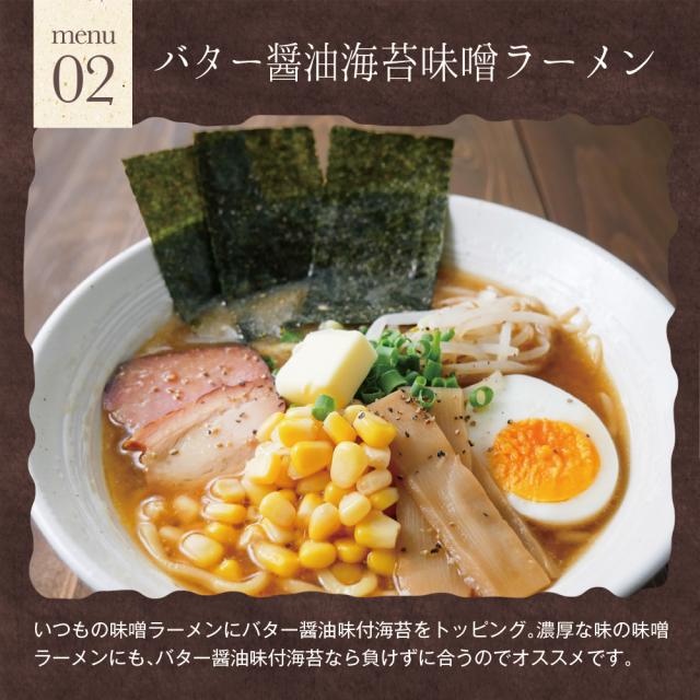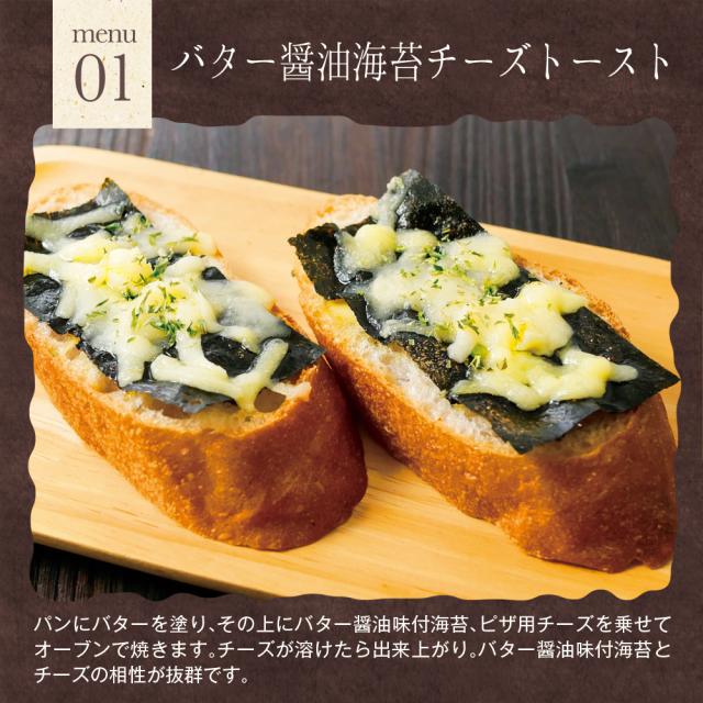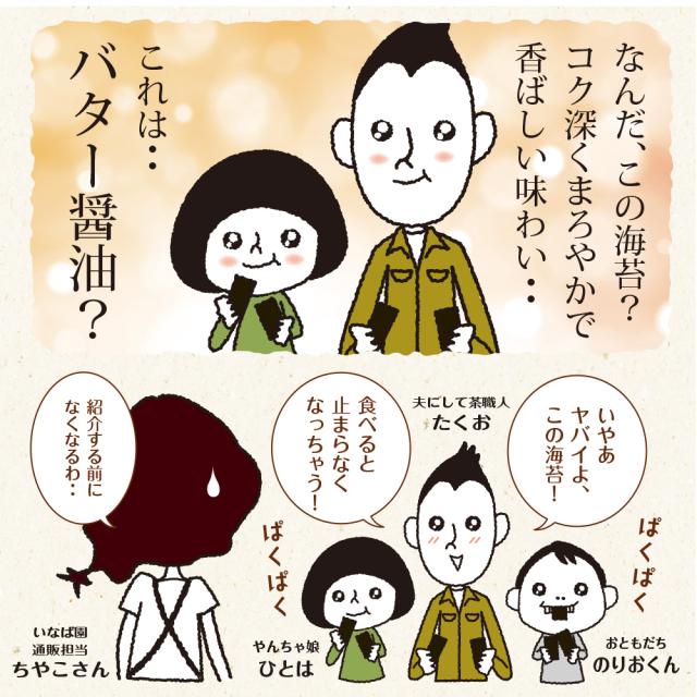 乾のり(有明海産)、調味液(砂糖、醤油、魚介エキス、その他)、醤油バターシーズニング(粉末醤油、ぶどう糖、食塩、魚介類エキスパウダー、砂糖、その他)/調味料(アミノ酸等)、香料、着色料(カラメル)、甘味料(ステビア、カンゾウ、スクラロース)、微粒二酸化ケイ素、香辛料抽出物、(一部にえび・小麦・乳成分・さば・大豆・鶏肉を含む)