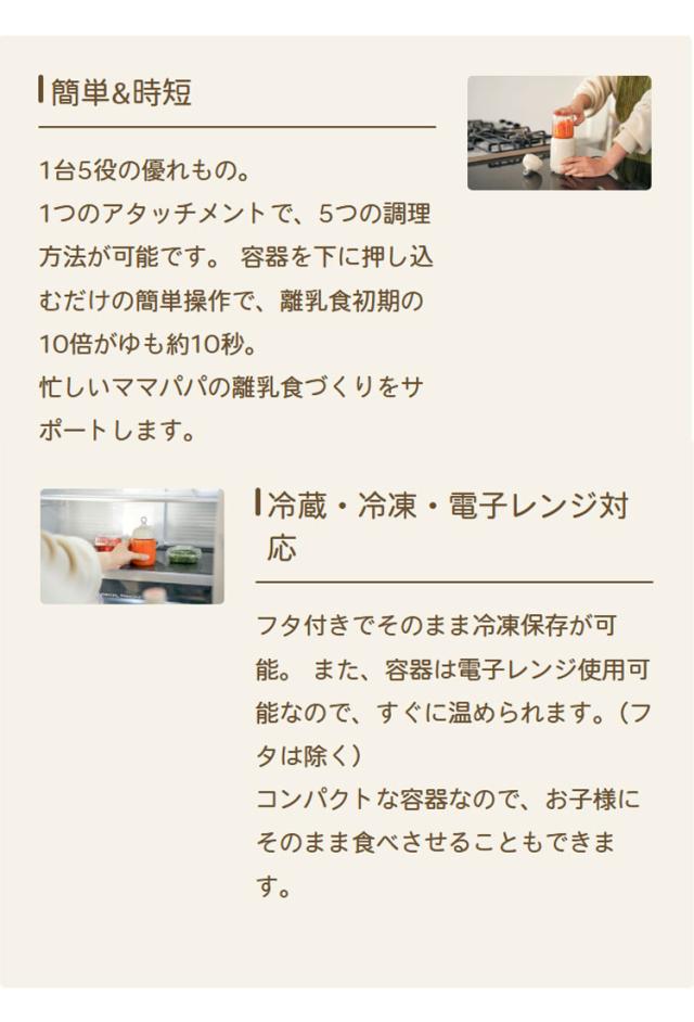 1つのアタッチメントで、5つの調理方法が可能です。 容器を下に押し込むだけの簡単操作で、離乳食初期の10倍がゆも約10秒。