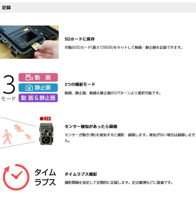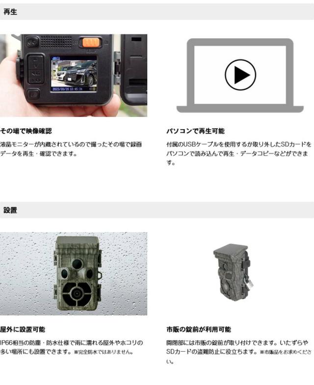 家周りの監視・室内の監視・駐車場の監視・バイク、自転車の監視・ペットの撮影、監視・倉庫物置の撮影、監視・不法投棄の監視・鳥獣被害、糞害の対策・催事、会議を手動録画・田畑の監視、植物のスケジュール撮影