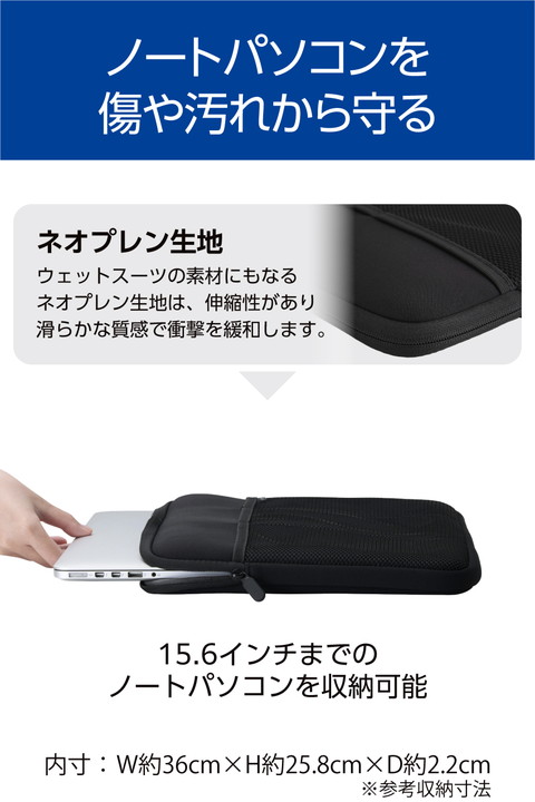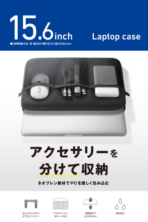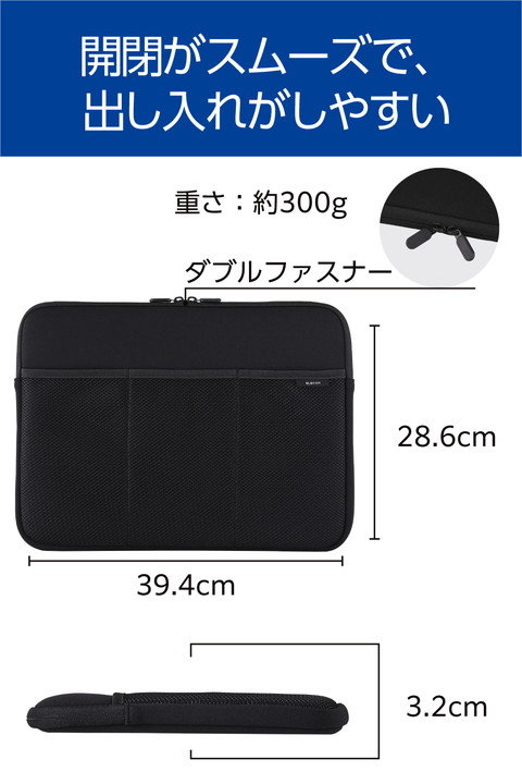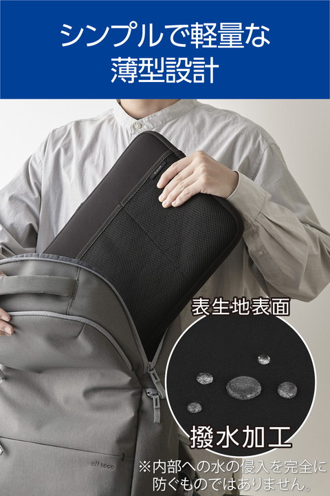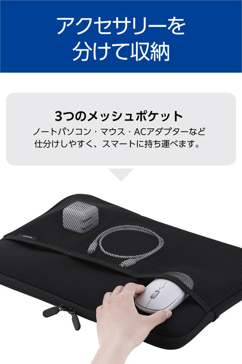ノートパソコンやマウス、ACアダプターなどをスマートに持ち運び可能!3つのメッシュポケット付きで仕分けしやすく、中身も一目でわかります。撥水生地を採用し、飲み物のこぼれや雨からも守れて安心です。![]() ■柔らかく伸縮性に優れたストレッチ素材を使用し、ノートパソコンを傷や汚れから守るインナーバッグです。 ■15.6インチまでのノートパソコンを収納可能です。 ■開閉がスムーズで、ノートパソコンの出し入れがしやすいダブルファスナーを採用しています。 ■ノートパソコン・マウス・ACアダプターなどをスマートに持ち運べます。 ■3つのメッシュポケットで仕分けしやすく、中に入っているものも一目瞭然です。 ■表生地表面に、撥水加工を施しています。 ■※内部への水の侵入を完全に防ぐものではありません。 ![]() ■外形寸法:W約394mm×H約286mm×D約32mm ■内寸:W約360mm×H約258mm×D約22mm ※参考収納寸法 ■重量:約300g ■材質:ポリエステル、クロロプレンゴム ■カラー:ブラック ■対応モデル:〜15.6インチまでのノートパソコン ■ポケット(前面):メッシュポケット×3 ■その他:撥水加工(表生地) |