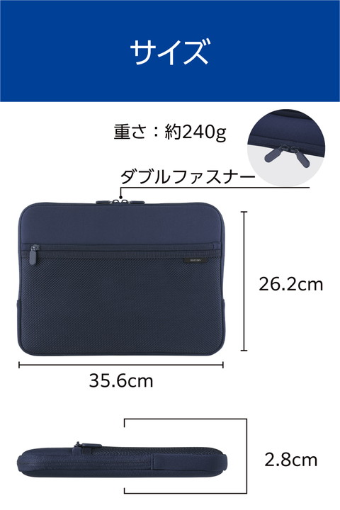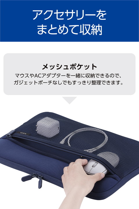 かばんの中にすっきり収納!マウスとACアダプターを同時に収納できる、インナーバッグです。メッシュポケット付きでガジェットポーチいらず。撥水生地を採用し、飲み物のこぼれや雨からも守れて安心です。![]() ■柔らかく伸縮性に優れたストレッチ素材を使用し、ノートパソコンを傷や汚れから守るインナーバッグです。 ■14.0インチまでのノートパソコンを収納可能です。 ■開閉がスムーズで、ノートパソコンの出し入れがしやすいダブルファスナーを採用しています。 ■ファスナー引き手部分にラバー素材を採用し、グリップ力を高め、他の収納物への傷を防ぎます。 ■マウスやACアダプターを一緒に収納できるメッシュポケット付き。ガジェットポーチなしでもすっきり整理できます。 ■表生地表面に、撥水加工を施しています。 ■※内部への水の侵入を完全に防ぐものではありません。 ![]() ■外形寸法:W約356mm×H約262mm×D約28mm ■内寸:W約325mm×H約230mm×D約20mm ※参考収納寸法 ■重量:約240g ■材質:ポリエステル、クロロプレンゴム ■カラー:ネイビー ■対応モデル:〜14.0インチまでのノートパソコン ■ポケット(前面):メッシュファスナーポケット×1 ■その他:撥水加工(表生地) |