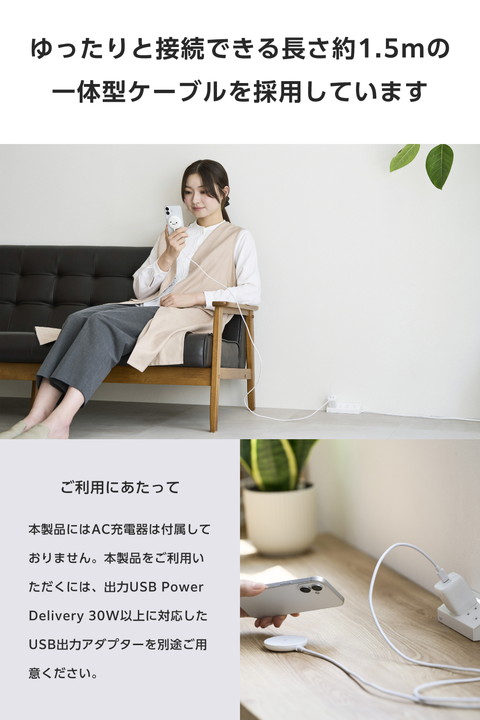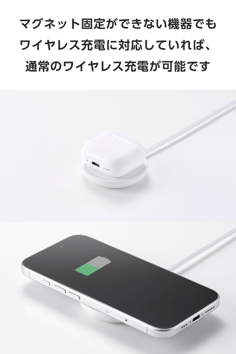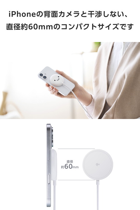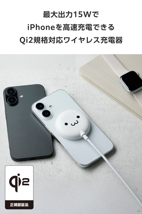 マグネットでQi2対応スマートフォンに固定するだけで充電できる、Qi2規格対応のワイヤレス充電器です。マグネットで背面にぴったりくっつくため、ワイヤレス充電中のスマホ操作も楽にできます。最大出力は15Wです。ポップなカラーも揃えたラインアップで、お気に入りを選んで使えます。かわいいしろちゃんモデルです。![]() ■マグネットでQi2対応スマートフォンに固定するだけで充電できる、Qi2規格対応のワイヤレス充電器です。 ■WPC(ワイヤレスパワーコンソーシアム)が策定したワイヤレス給電の国際標準規格「Qi(チー)2」に準拠した正規認証品です。 ■※エレコムはワイヤレスパワーコンソーシアムの会員企業です。 ■最大出力15WでiPhoneを充電可能。従来のQi規格と比べて高速充電を実現しています。 ■iPhoneの背面カメラと干渉しない、直径約60mmのコンパクトサイズです。 ■マグネットでスマートフォンの背面にぴったりくっつくため、ワイヤレス充電中のスマホ操作も楽にできます。 ■スマートフォンが鳴っても、振動で充電部分がズレたり外れたりせず、安定して充電が可能です。 ■異物検知機能を搭載しており、安全にご利用いただけます。 ■スマートフォンが濡れた直後でも、背面の水滴を拭き取ることですぐに充電できます。「コネクターが濡れてすぐに接続できない…」といったシーンでも活躍します。 ■※本製品に防水機能はありません。 ■ケースを付けたまま充電することも可能です。 ■※厚さ3mm以下のケースおよびワイヤレス充電対応ケースのみ。またマグネットでの固定は対応ケースのみ。左記に該当しても、その仕様や条件によっては充電できない場合があります。 ■ワイヤレス充電対応ケース以外の、金属・磁石などを含むスマホリング・ケースなどはご利用いただけません。発熱の危険性があるため取り外してご利用ください。 ■かわいいしろちゃんモデルです。 ■ゆったりと接続できる長さ約1.5mの一体型ケーブルを採用。本体と同じ色となっているためデザイン性も損ないません。 ■一体型ケーブルにはUSB Type-C(TM)プラグを採用しています。USB Type-CポートのあるAC充電器などから充電できます。 ■※本製品にはUSB出力アダプター(AC充電器など)は付属しておりません。本製品をご利用いただくには、出力USB Power Delivery 30W以上に対応したUSB出力アダプターを別途ご用意ください。 ■※充電対応機種は対応表をご確認ください。 ■※USB Type-C and USB-C are trademarks of USB Implementers Forum ■自社環境認定基準を1つ以上満たし、『THINK ECOLOGY』マークを表示した製品です。 ■廃棄物削減に取り組み、製品に同梱する取扱説明書等をペーパーレス化した製品です。 ■環境保全に取り組み、製品の包装容器におけるプラスチック重量を、社内基準製品より20%以上削減した製品です。 ■環境保全に取り組み、製品本体の主たる構成部品や構成要素の原料に占めるリサイクル原料の割合が10%を超えている製品です。 ![]() ■対応機種:Qi2(MPP)15W規格のワイヤレス充電に対応した機器 ■入力:最大5V/2Aまたは9V/3A(USB Power Delivery対応) ■出力:5W/7.5W/15W ■入力端子:USB Type-C(TM) プラグ(ケーブル一体型) ■外形寸法:直径約58mm×高さ約11mm ※ケーブル除く ■重量:約80g ※ケーブル、コネクター含む ■使用温度範囲:-10℃〜28℃ ■使用湿度範囲:10%〜85% ■認証規格:Qi2(MPP) ■カラー:しろちゃん(ホワイト×ブラック) ■ケーブル仕様:本体一体型 USB Type-Cケーブル ■ケーブル長:約1.5m ■ケーブル色:ホワイト ■保証期間:1年間 ■保証対象地域:日本 ■その他:本製品にはUSB出力アダプター(AC充電器等)は付属しておりません。USB Power Delivery 30W以上に対応したUSB出力アダプターを別途ご用意ください。 |