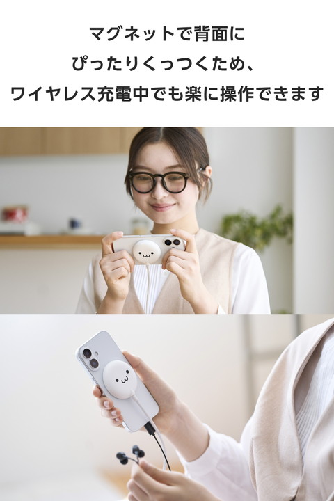マグネットでQi2対応スマートフォンに固定するだけで充電できる、Qi2規格対応のワイヤレス充電器です。マグネットで背面にぴったりくっつくため、ワイヤレス充電中のスマホ操作も楽にできます。最大出力は15Wです。ポップなカラーも揃えたラインアップで、お気に入りを選んで使えます。かわいいしろちゃんモデルです。