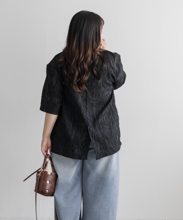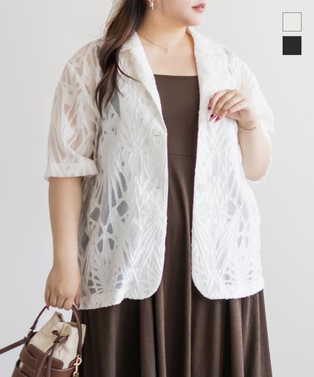 | 3Lサイズを着用して、肩まわりや腕にもゆとりがあり、羽織っていても窮屈感のない着心地でした♪ほんのり透け感のあるジャガード素材が、夏らしい軽やかさを演出してくれて、羽織るだけでコーデが上品にまとまります。テーラードデザインできちんと感がありながらも、かっちりしすぎず、Tシャツやワンピースとのレイヤードにもぴったり◎ヒップにかかる丈感で体型カバーもできて、気になる部分をさりげなく隠せるのもうれしいポイントです! 冷房・日よけ対策にも活躍してくれて、夏の羽織りとして1枚持っておきたいアイテムです! |