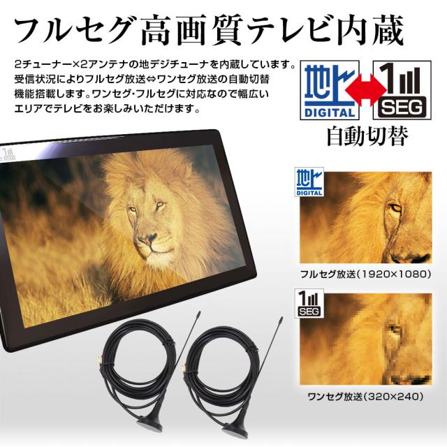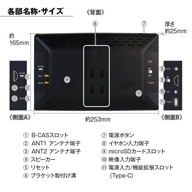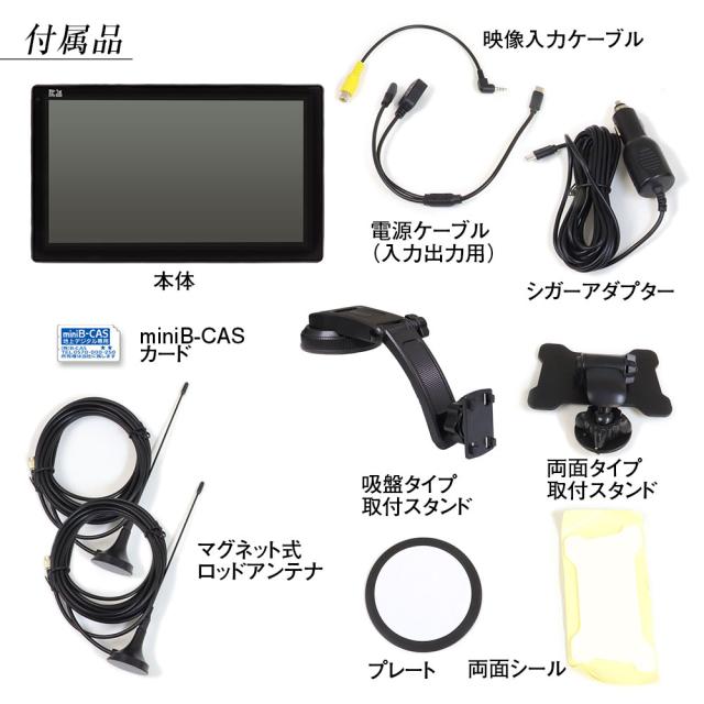 | 表示液晶 : 10.1インチ高解像度IPSタッチパネル液晶 画素数:1024×600pixel チューナー:2チューナー&2アンテナ 放送方式:地上デジタル放送方式(日本) 入力電圧:DC12V/24V サイズ:約254(W)×約156(H)×約24(D)mm(本体最大部・スタンド含まず) 重量:約650g 保証期間:1年間保証 |