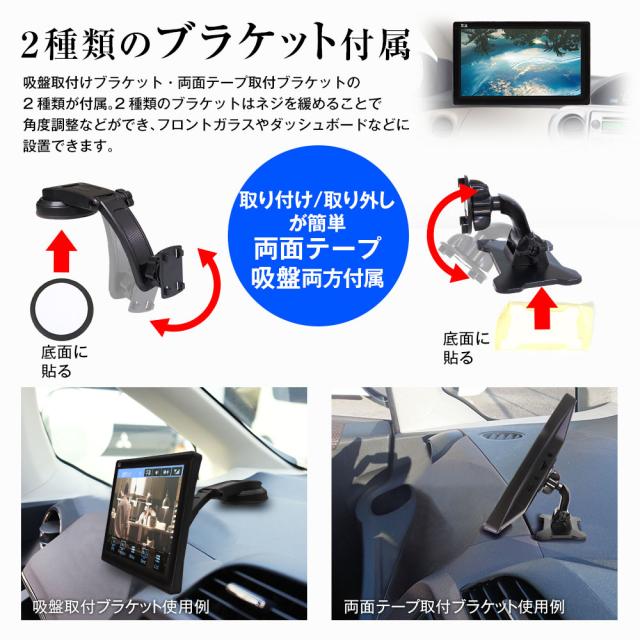 吸盤取付けブラケット・両面テープ取付ブラケットの2種類が付属。2種類のブラケットはネジを緩めることで角度調整などができ、フロントガラスやダッシュボードなどに設置できます。貼るだけだから取り付けがとても簡単です。