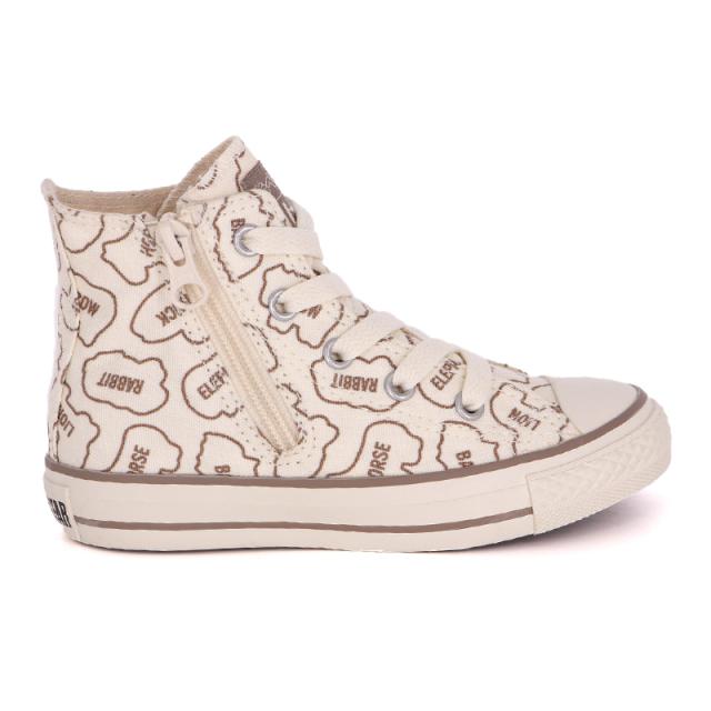 【商品特徴】 チャイルドオールスターのコラボレーションモデルオフホワイト・ギンビス社のロングセラー商品であるビスケット菓子「たべっ子どうぶつ」とのコラボレーションモデル・どうぶつ型のビスケットを総柄プリントで採用した可愛らしいデザイン・ビスケットのイメージから、テープのラインや織ネームをブラウンにアレンジすることでナチュラルテイストにまとめた1足・ファミリーペア(キッズ、ベビー)モデル・「たべっ子どうぶつ」と「ALL★STAR」のオリジナル織ネームをタンに付加・パッケージデザインを落とし込んだコラボオリジナルのカートン仕様【フレックスソール】【フレックスポイント】【抗菌カップインソール】【フィッティングチェッカー】【ビッグスライダー】