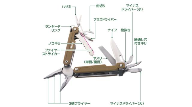 [機能]3徳プライヤー、ナイフ、ノコギリ、ハサミ、ヤスリ(単目/複目)、プラスドライバー、マイナスドライバー(大/小)、栓抜き、缶切り、紐通し穴付きキリ、ファイヤーストライカー、ランヤードリング