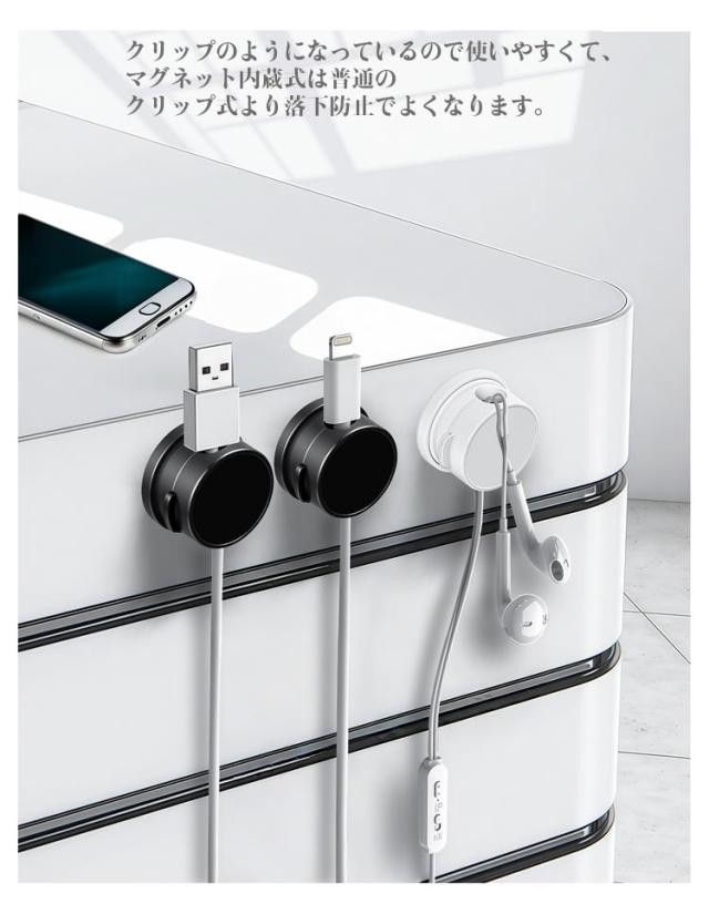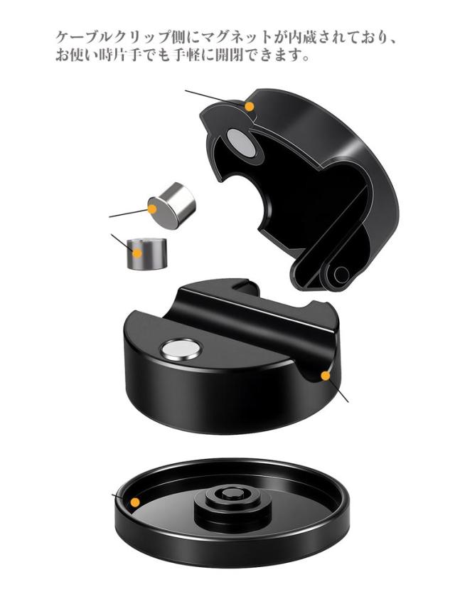 | ケーブル収納対策! ケーブルクリップ側にマグネットが内蔵されており、お使い時片手でも手軽に開閉できます。 クリップのようになっているので使いやすくて、マグネット内蔵式は普通のクリップ式より落下防止でよくなります。 充電ケーブル、電気製品コード、USBケーブル、lanケーブル、ACケーブルなどの幅広いケーブルに利用することが可能! 特別な360°回転設計を採用し、引っ張ったケーブルの向きを自由に変えらるので、使用方向を後から変更することの難しさを解決します。 小型のサイズのため、貼る場所を選ばず設置できます。 | |