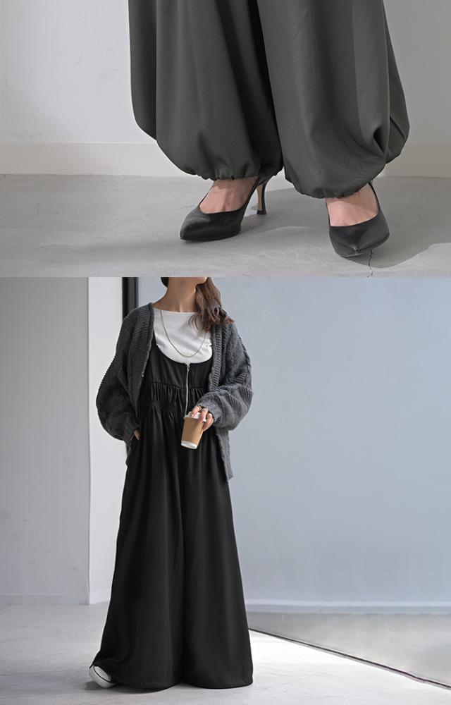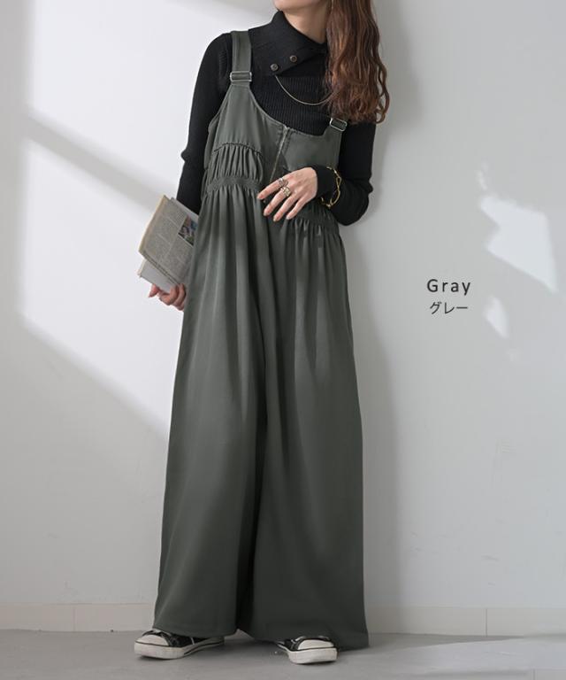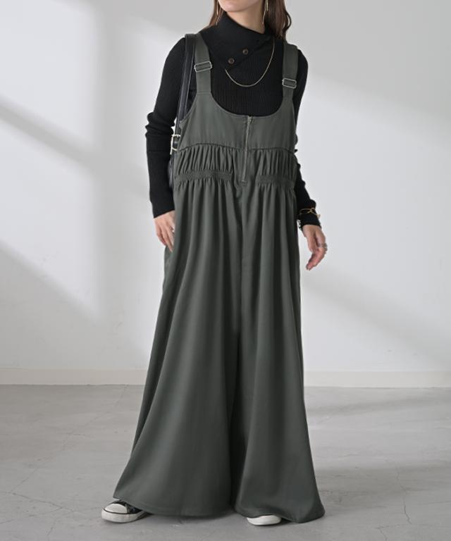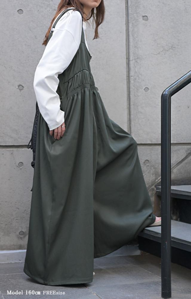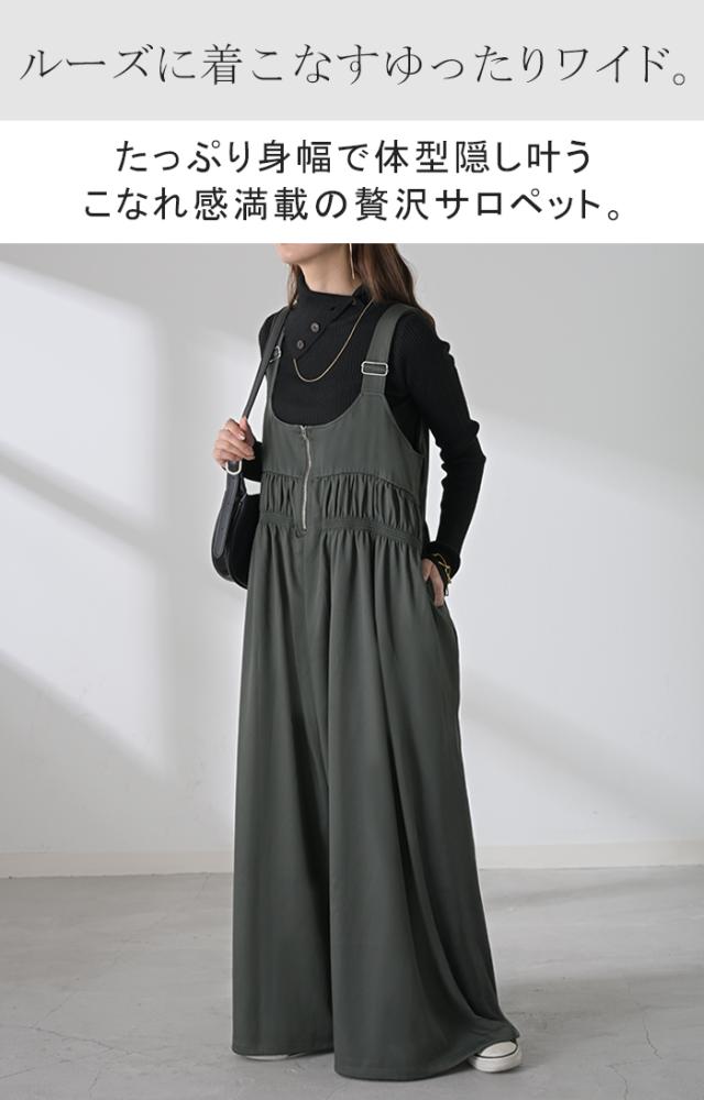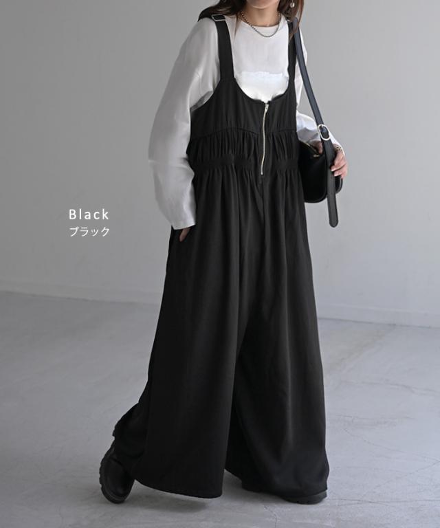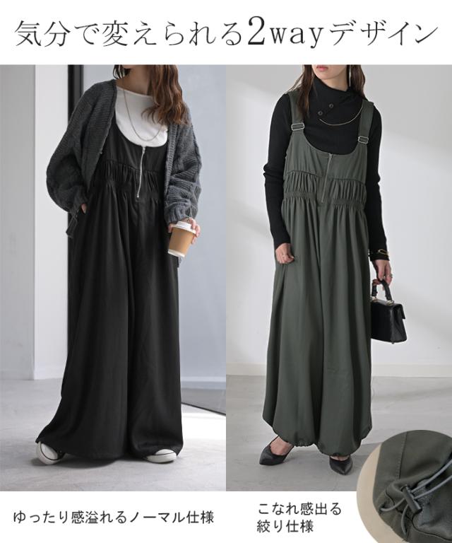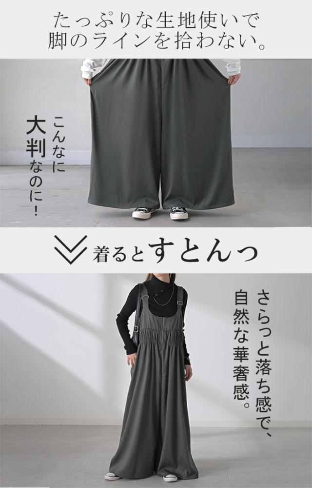 2025AW新作 サロペット シャーリング レディース サロペ ワイド パンツ ロング ロングパンツ ノースリーブ オーバー オーバーオール レイヤード 重ね着 肩紐 調節可能 ゆったり オーバーサイズ 大きいサイズ 体型カバー 黒 グレー 秋 冬 HUG.U 秋新作