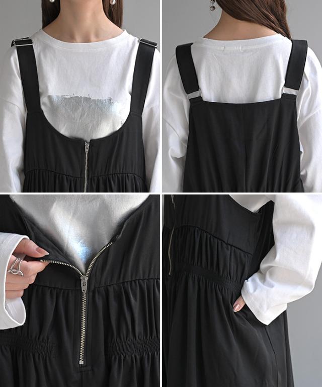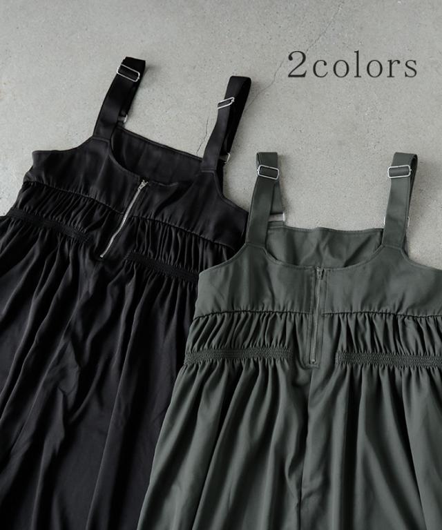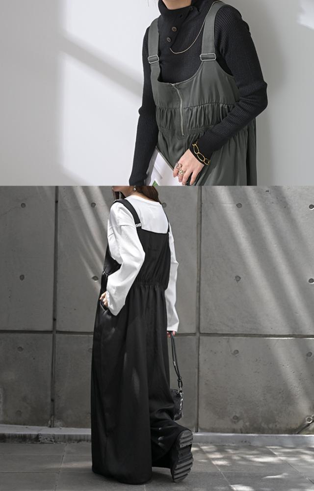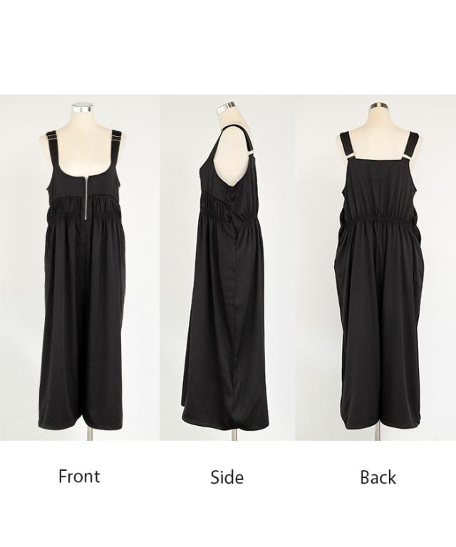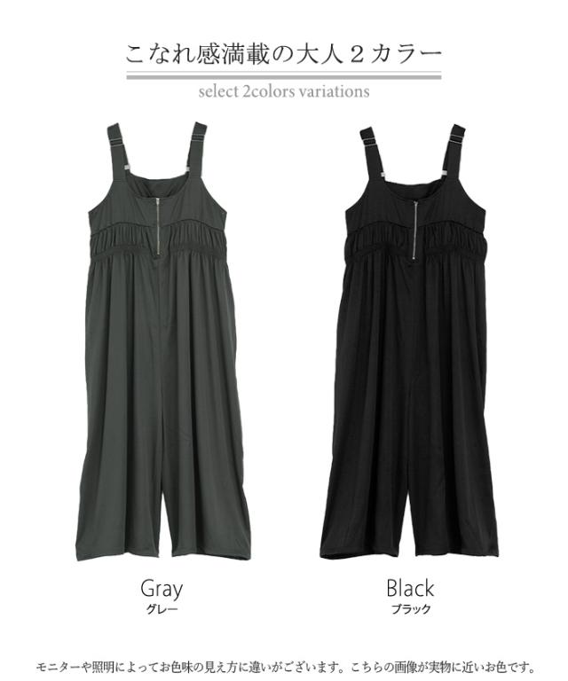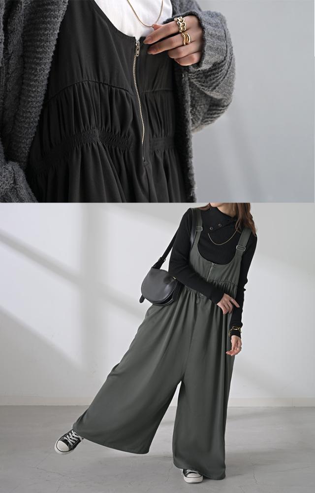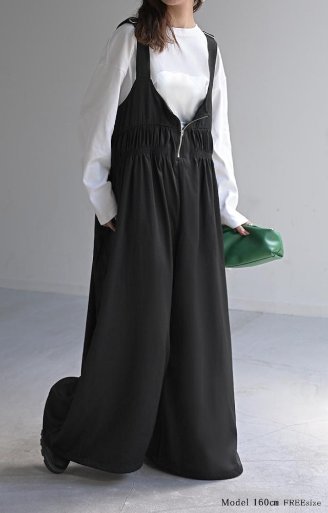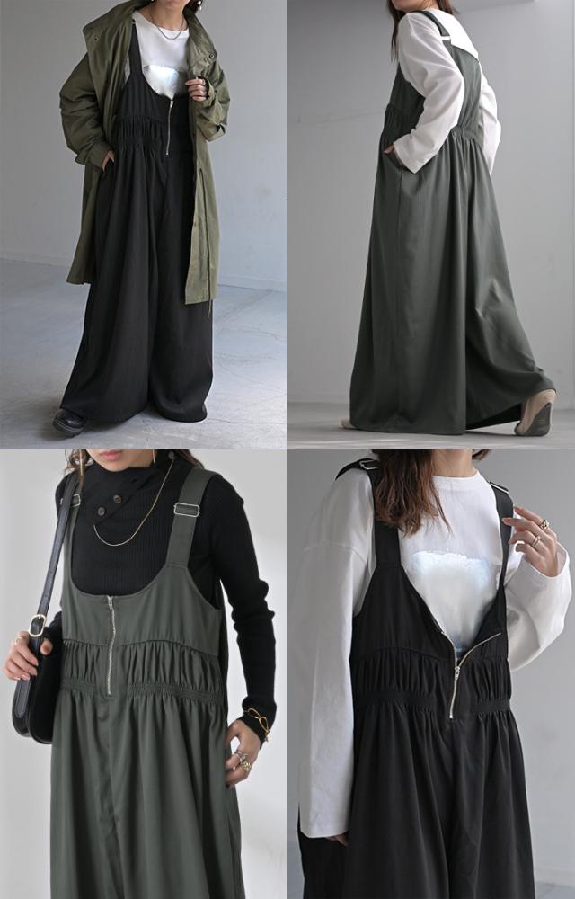 フロントファスナーとシャーリングをたっぷりいれたお洒落なサロペットです。