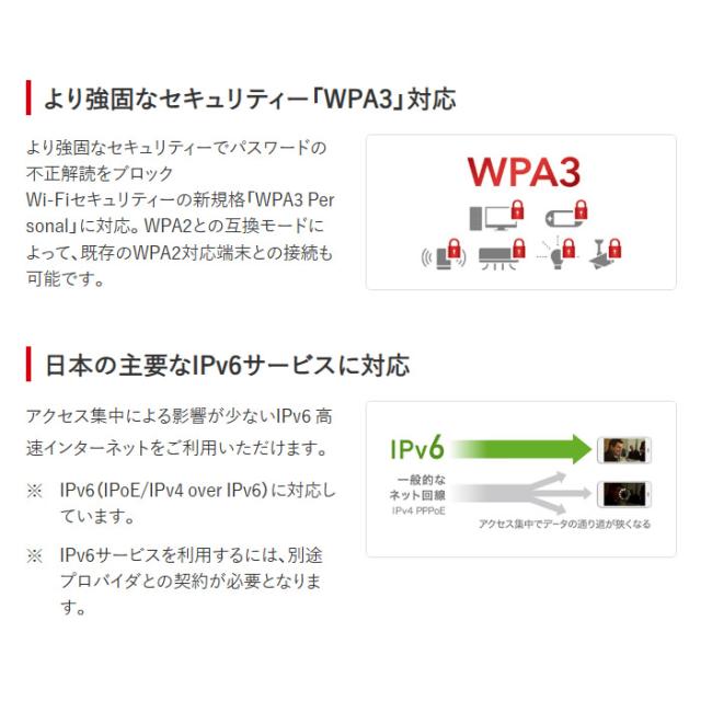 Wi-Fiセキュリティーの新規格「WPA3 Personal」に対応。WPA2との互換モードによって、既存のWPA2対応端末との接続も可能です。