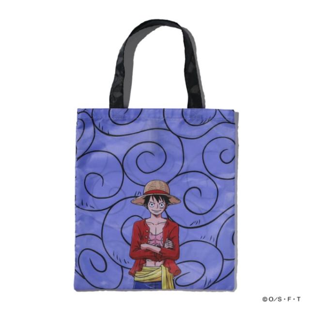 大人気TVアニメ『ONE PIECE』とのスペシャルコラボレーションアイテム。悪魔の実“ゴムゴムの実”デザインのトートバッグ。小さく折りたたみができA4サイズが収納可能