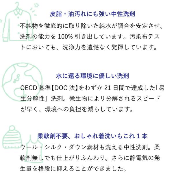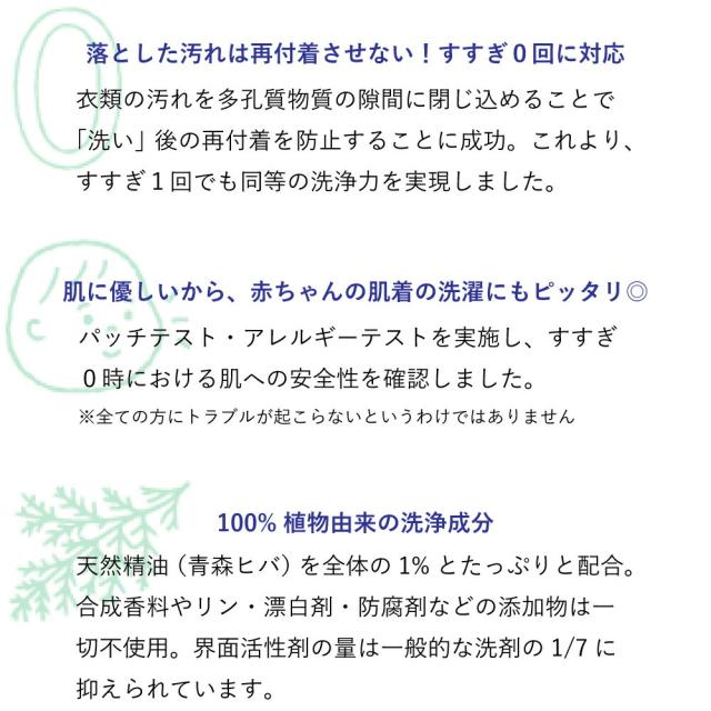 ヒバ精油の香りが広がる。 確かな洗浄力と肌への優しさを兼ね備えた、すすぎ「0」でも使用できるマルチタスクな洗濯洗剤。中性洗剤で、コットン・ウール・シルク・ダウン素材や、レインウェアなどの防水透湿性素材の衣類にもお使いいただけます。