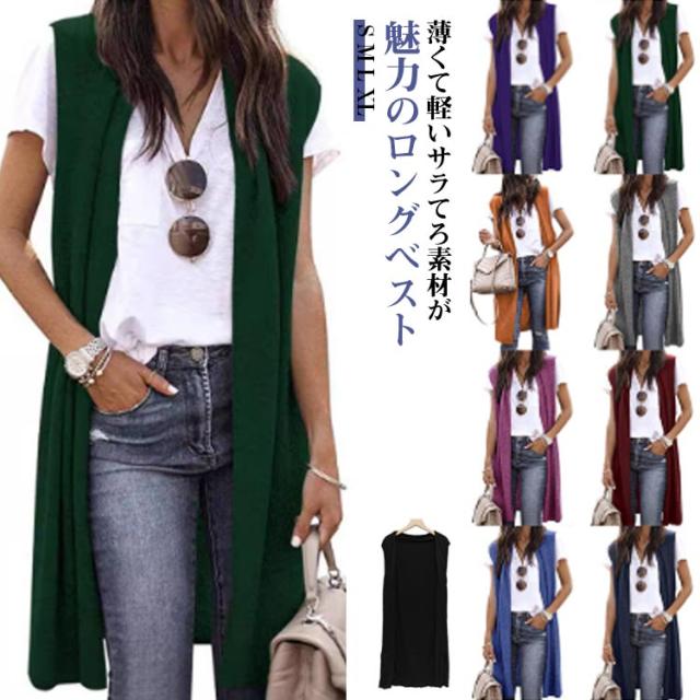 ロング丈 レディース 前開き ジレ 夏 体型カバー カーディガン ノースリーブ ロング丈 ジャケット サマーカーディガン ベスト 涼しい スリット入り トップス 薄手 ロングベスト ロングジレ ノーカラー 羽織り 無地 シンプル きれいめ 軽量 秋 春