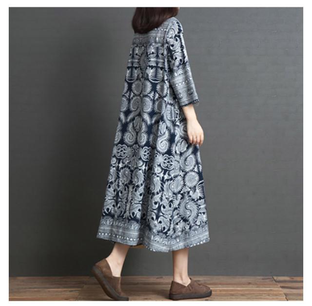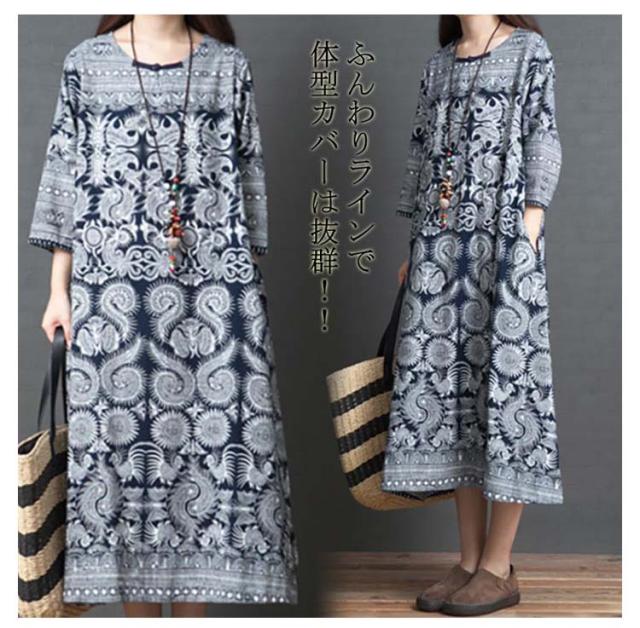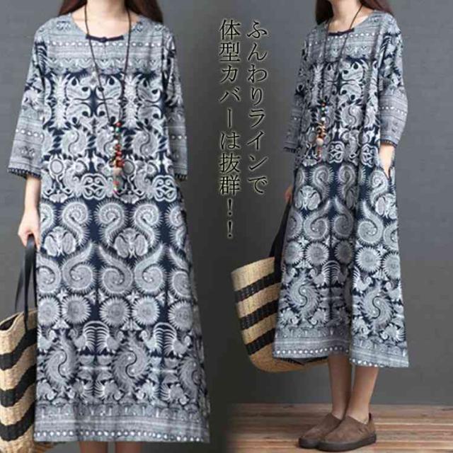 ワンピース レディース 秋 綿麻混 七分袖 ロング丈 Aライン 体型カバー 大きいサイズ ゆったり 民族風 花柄 秋物 女性 30代40代50代