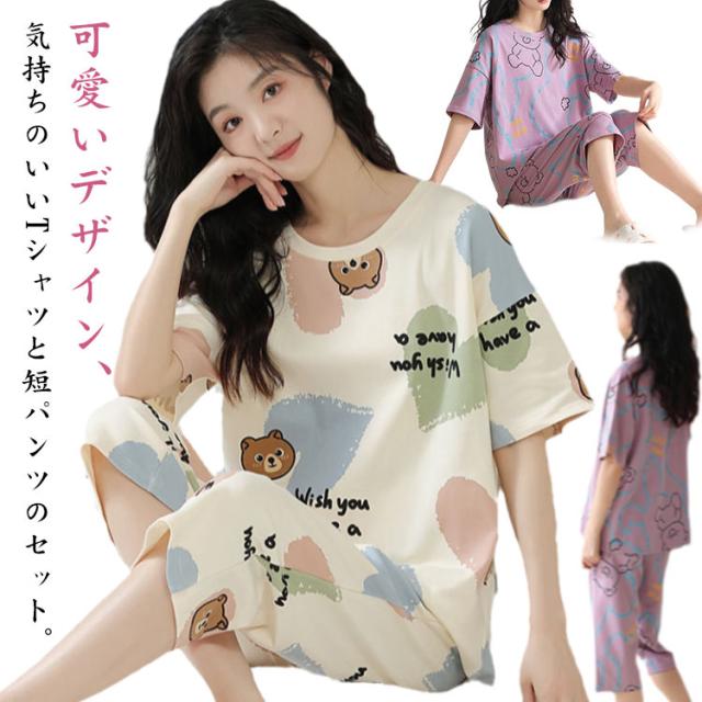 レディース 可愛いパジャマ 上下セット 夏用パジャマ 大人用 ルームウェア 丸首 上下セット 春 半袖パジャマ 母の日 秋 部屋着 L 襟なし 夏パジャマ 夏 かわいい 綿 XL 大人用 パジャマ 上下セット 大きいサイズ 部屋着