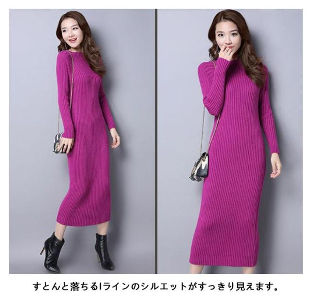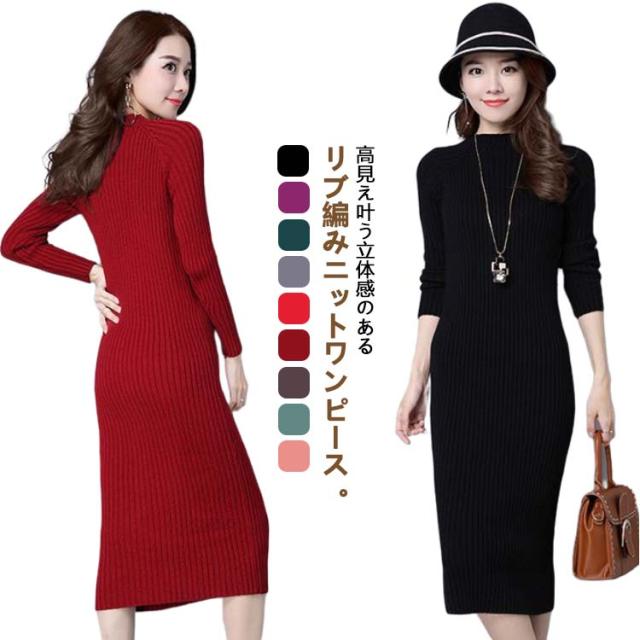 リブニット リブワンピ リブ リブニットワンピース リブニットワンピース ニットワンピース ワンピース リブワンピース タイト ロング丈 長袖 無地 秋 冬
