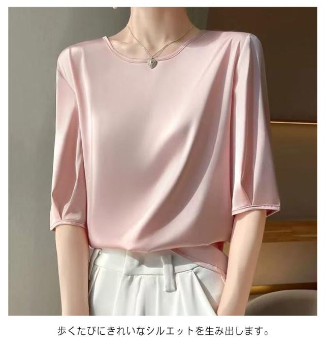 シャツ シャツブラウス ブラウス プルオーバー インナー サテン ひんやり シャツ トップス 光沢感 体型カバー 大きいサイズ tシャツ 薄手 滑らか 半袖 吸湿 高品質 敏感肌 レディース 透けない 清楚感 重ね着 大人 きれいめ