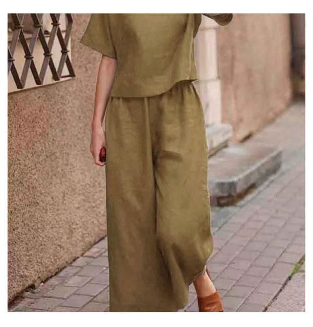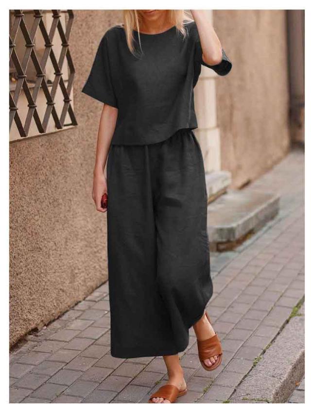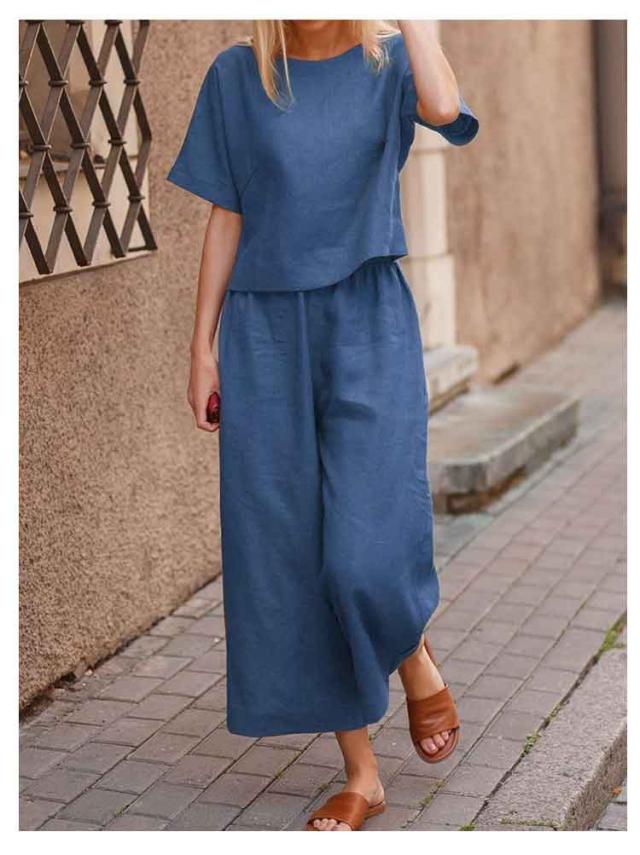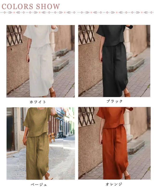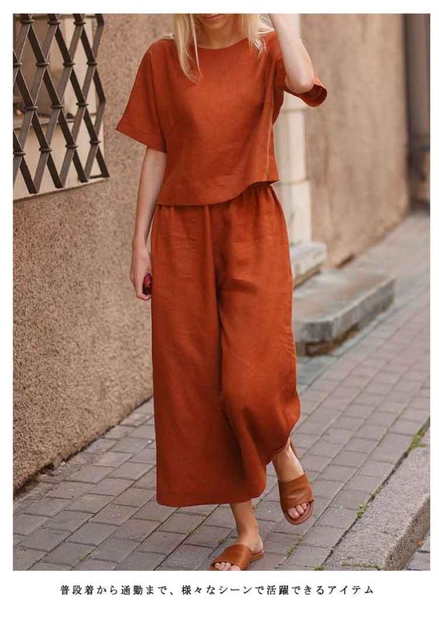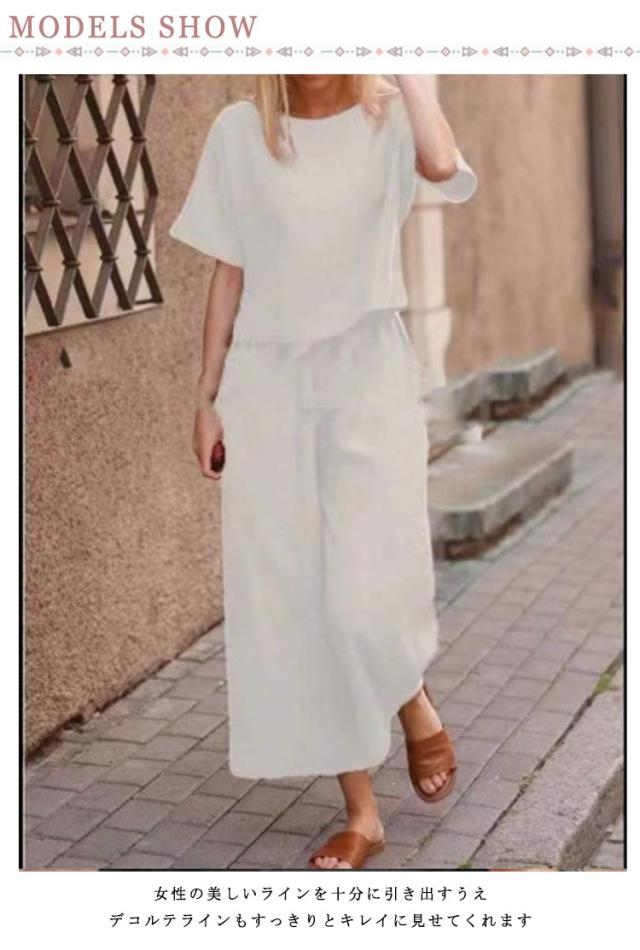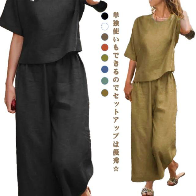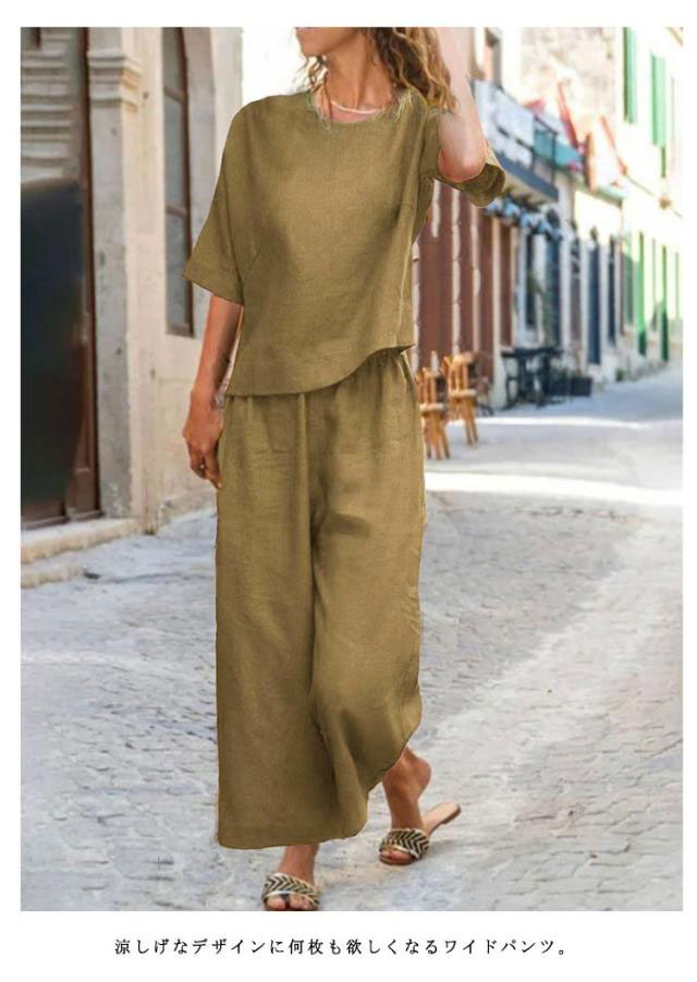 ブラウス 上下セット ボトムス レディース ワイドパンツ リネン 上下セット 半袖 トップス きれいめ カジュアル 夏 夏 ロングパンツ 体型カバー パンツセットアップ 美シルエット 美脚 パンツスーツ 無地 ゆったり 着痩せ 冷感素材 部屋着 ルームウェア 春夏