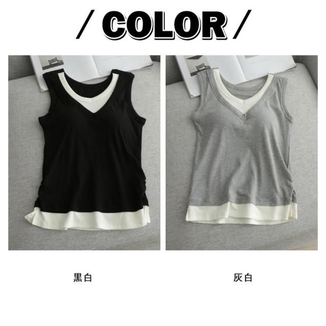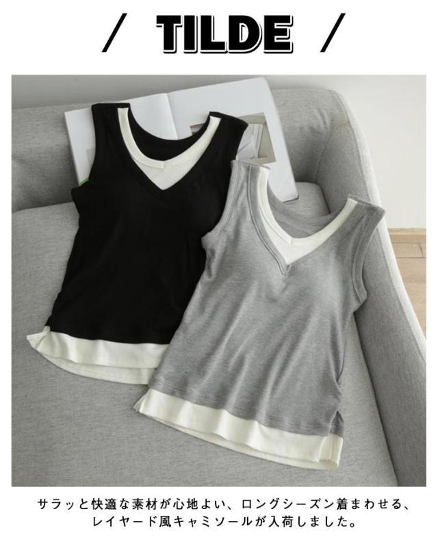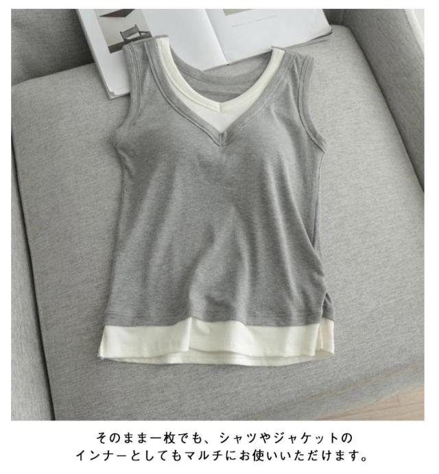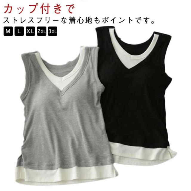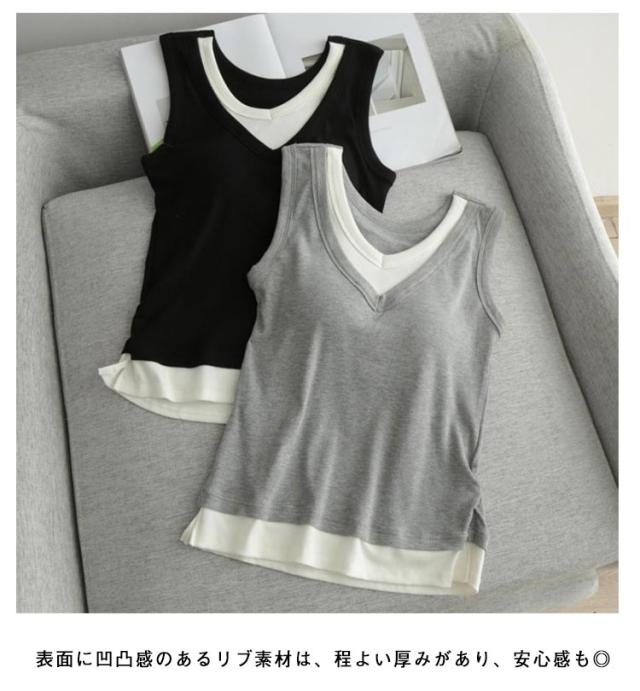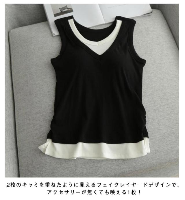 レディース カップ付き ブラキャミソール レイヤード風 通気性 タンクトップ カップ付きタンクトップ キャミソール Vネック カップ付き 重ね着風 秋 サイドスリット フェイクレイヤード 透けない ノースリーブ ストレッチ 夏 春 無地 シンプル 大人可愛い