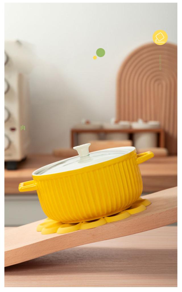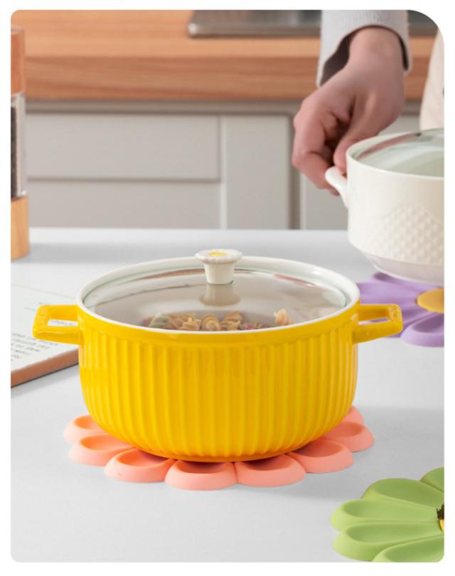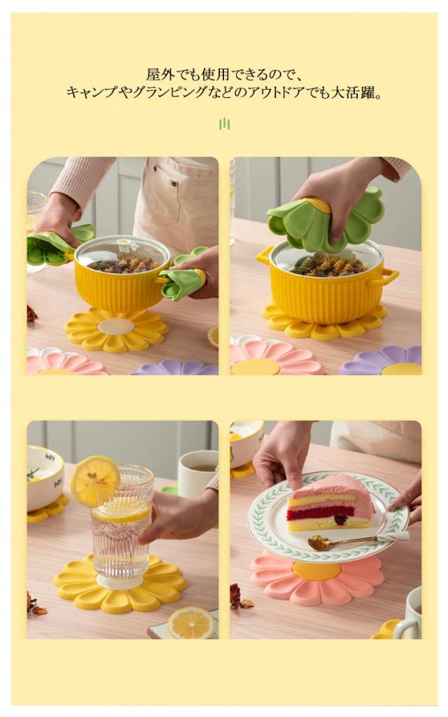 | テーブルを守る断熱鍋敷きです。 シンプルなデザインで安定して鍋を置けます。 衝撃吸収だけでなく、滑り止めとしても使えます。 シリコン素材で洗いやすい。汚れても拭き取ることが出来ます。 花の様な形をしていておしゃれです。コースターや鍋つかみとしても利用可能♪ 5色から選べるカラフルなデザインで、食卓を華やかにコーディネート。 屋外でも使用できるので、キャンプやグランピングなどのアウトドアでも大活躍。 | |