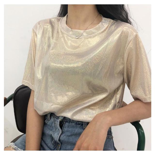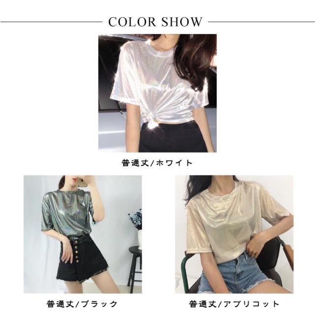 | キラキラ反射のラメ素材Tシャツ 蒸れ感もなく、サラッと軽く薄く着心地良い。 普段使いにはもちろん、ダンス・ステージ衣装にもピッタリ! ショートパンツやホットパンツなどと合わせやすい。 メリハリのあるシルエットが女性らしさを醸し出す一着。 | |