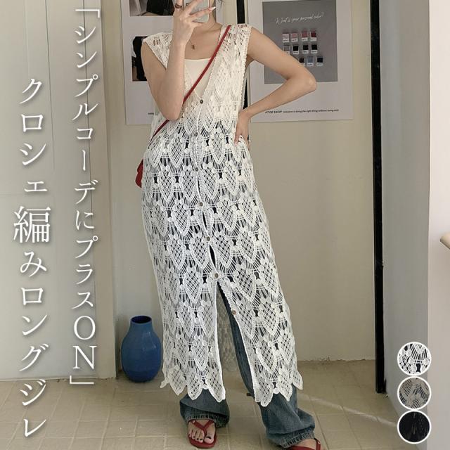 夏新作 「コーデに夏感プラス」ジレ クロシェ編み ロング丈 Vネック ベスト レディース トップス ノースリーブ サマーニット きれいめ 前開き レース 透け感 レイヤード モヘア風 毛羽立ち フロントボタン 大人 リゾート 中厚手 幾何学 黒 白 春夏