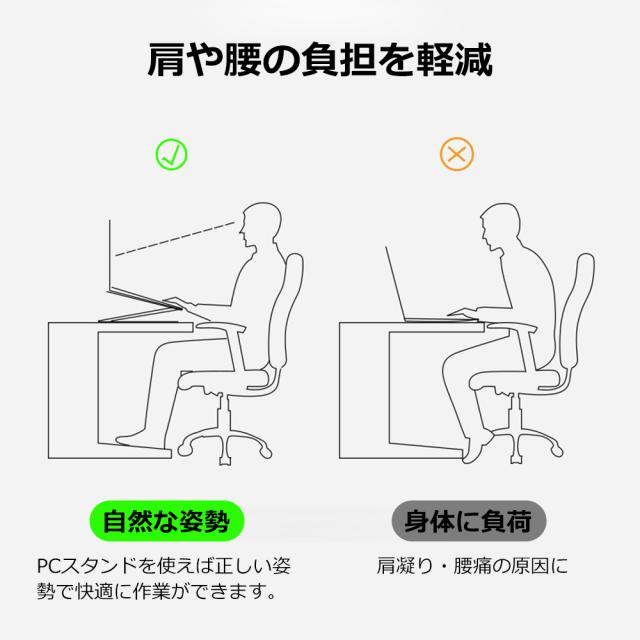 通風穴の設計&放熱性抜群本ノートパソコンスタンドは熱伝導性が優れているアルミ合金製で、熱によるパソコンの動作自体が強制終了するトラブルを防ぐことができます。ノートパソコンとの接触面に通風穴を設けて、空気の流動性と放熱性を向上させているので、パソコンなどのデバイスの使用寿命を延ばし、ノートパソコンはより速く運行することができます。 夏場の熱暴走対策にも活躍します。