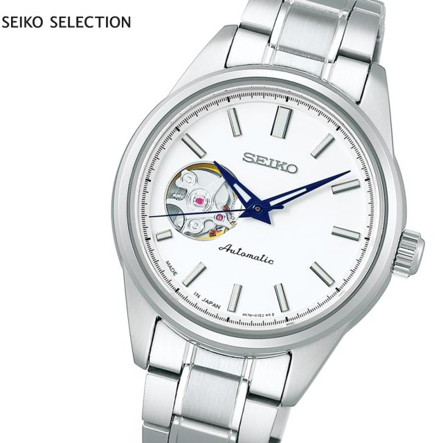 安心の実用スペックを備えた、お手頃価格のメイドイン・ジャパン メカニカルウオッチ。キャリバー4R38の自動巻き(手巻き付き)、約41時間パワーリザーブ、10気圧防水、オープンハート仕様。シンプルな中に華やかさを備えた機械式時計です。【セイコー セレクション SEIKO SELECTION】