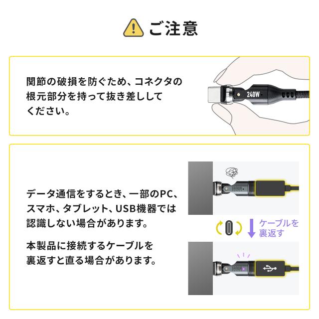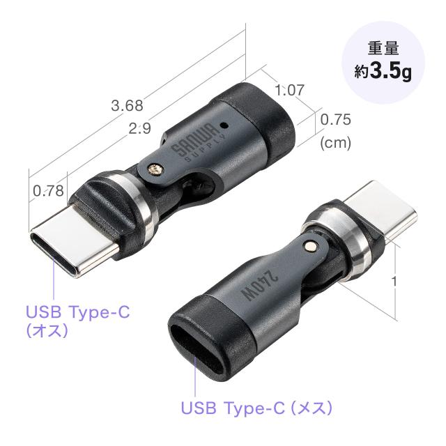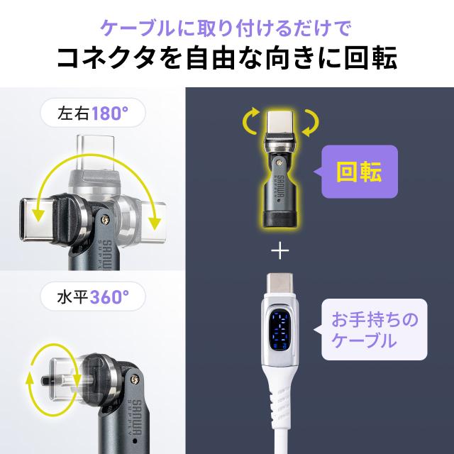 ⇒ご購入の前にご確認下さい540度(左右180度+水平360度)回転するUSB-C変換アダプタ。向きを気にせずに使用できる。ケーブルの断線やコネクタの損傷を防ぐ。コネクタの向きを自由に調整でき、快適に使用できる。通電LED付き。PD240Wにまでの急速充電に対応。USB2.0の転送速度。