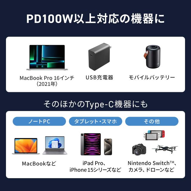 ●PD240Wにまでの急速充電に対応しており、スマートフォンやタブレットはもちろん、ノートパソコンの充電にも対応しています。