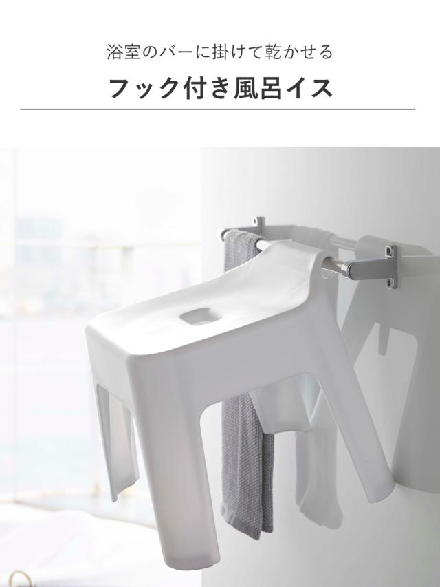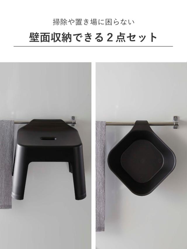 浴室のバーや扉に引っ掛けられる風呂イスとマグネットでピタっとくっつく湯おけのセットです。浴室の床に直接置かないので、ヌメリや水垢が付くのを防ぎ、清潔に収納できてお掃除もラクラクです。シンプルなデザインで、お風呂のどこに置いても馴染みます。