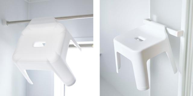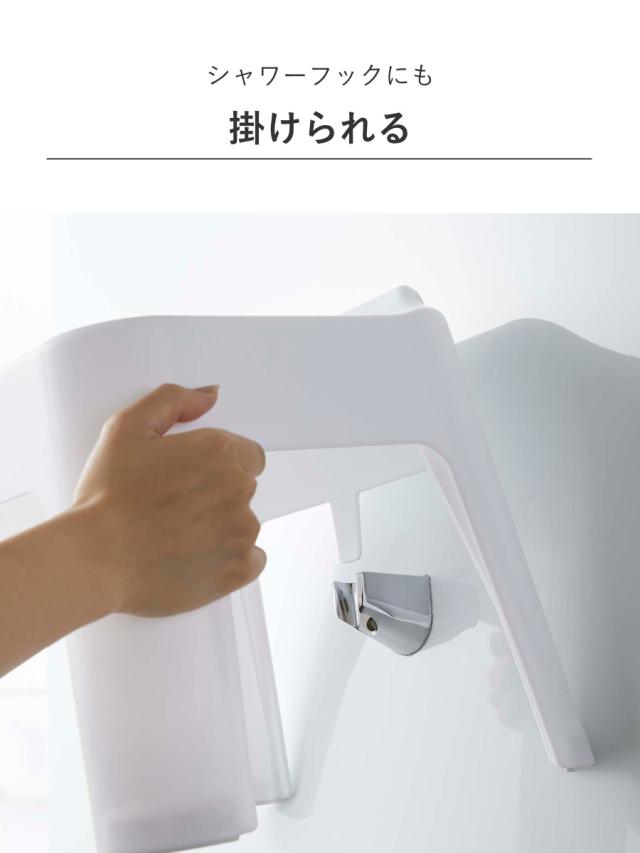 イスの背面にはシャワーフックに差し込めるプレートが付いてます。フックで引っ掛けるだけでなく、プレートをシャワーフックに差し込んで浮かせて収納できます。