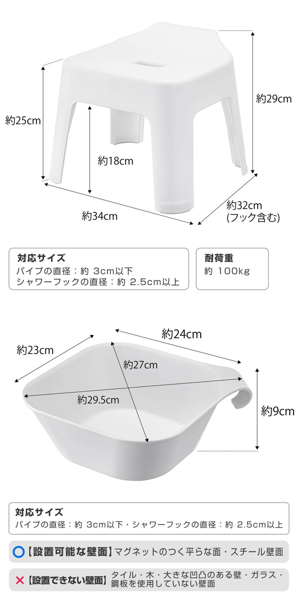 | 対応サイズ | 【引っ掛け風呂イス】 パイプの直径/約3cm以下、シャワーフックの直径/約2.5cm以上 【マグネット&引っ掛け湯おけ】 パイプの直径/約3cm以下、シャワーフックの直径/約2.5cm以上 |
