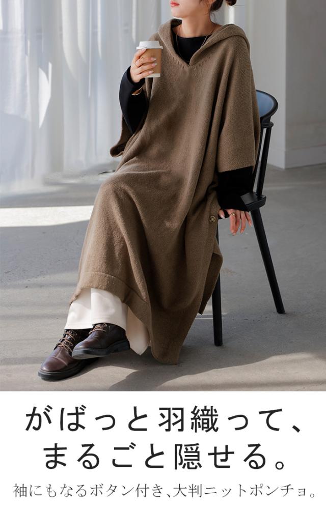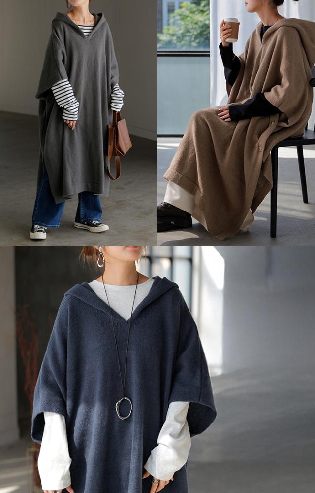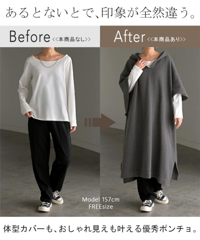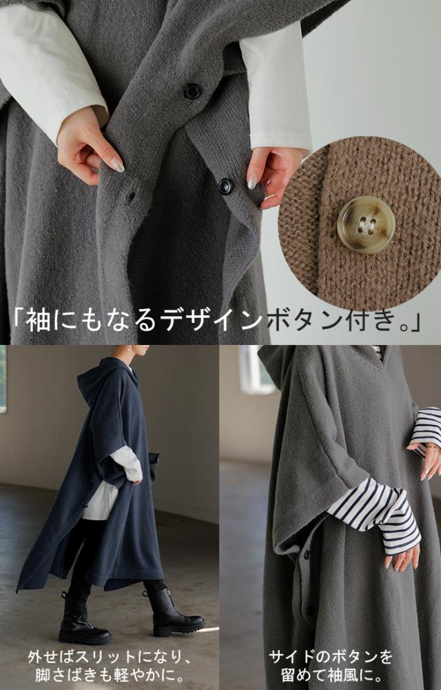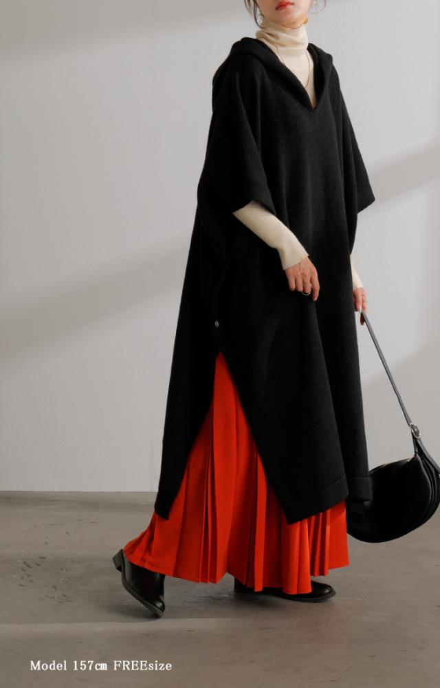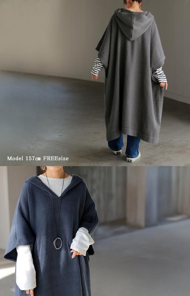 オーバーサイズがかわいいフード付きニットポンチョです。