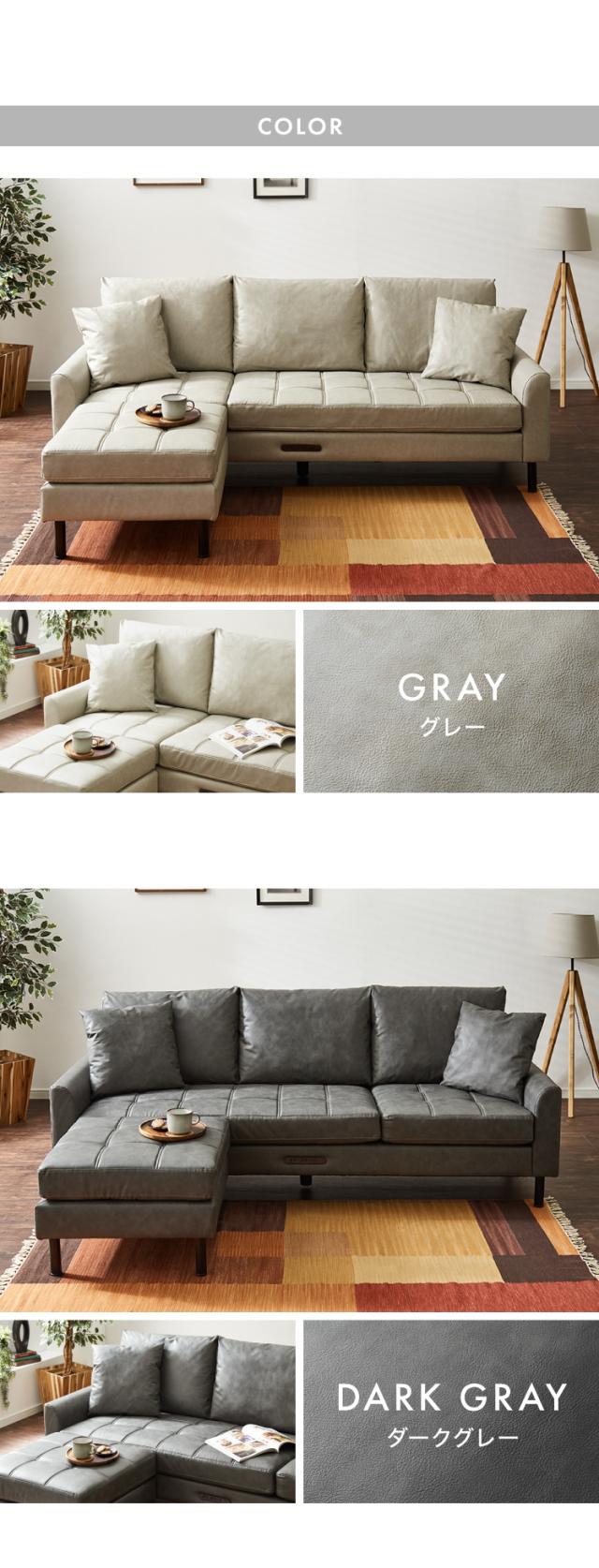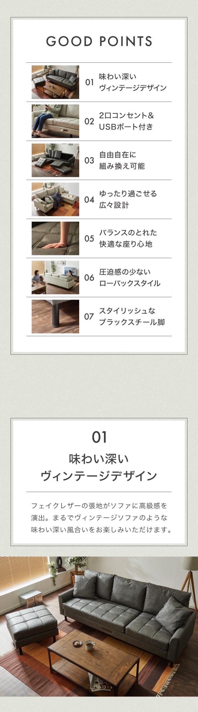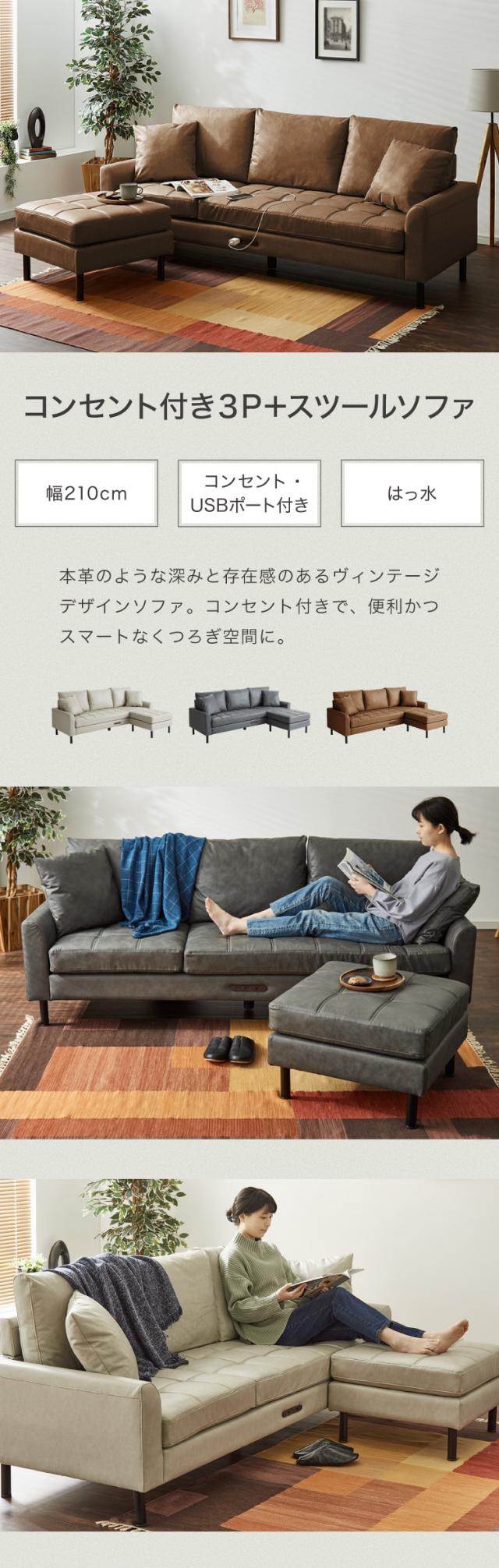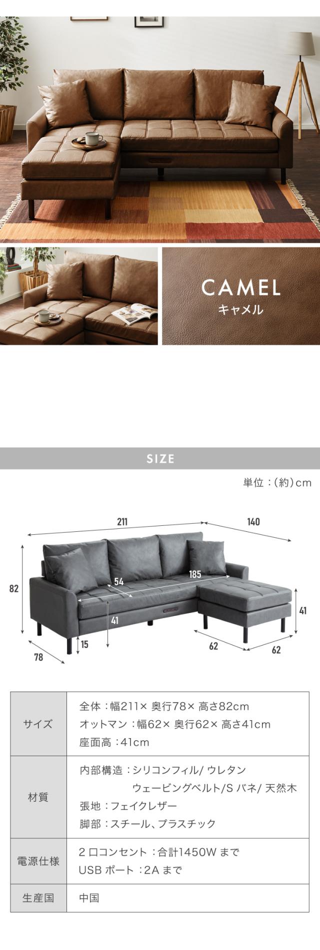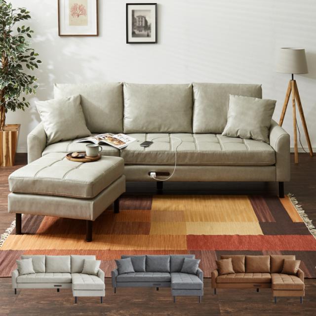 ソファ カウチソファ コンセント USB 充電 3人掛け L字型 あぐら ファブリックレザー 幅210 カウチ 組合せ ヴィンテージ(代引不可)