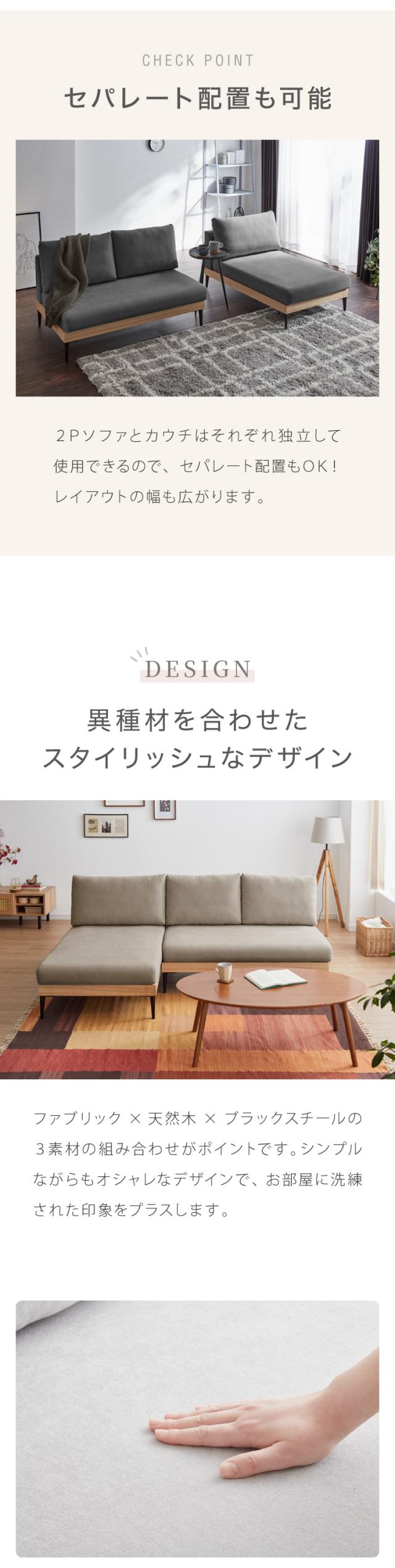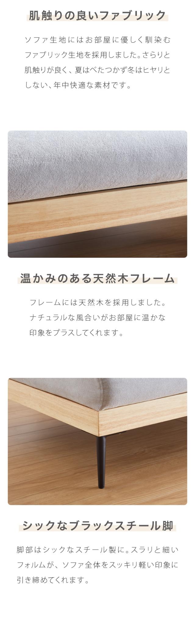 ファブリック×天然木×ブラックスチールの3つの異素材を組み合わせたデザイン性抜群のソファです。