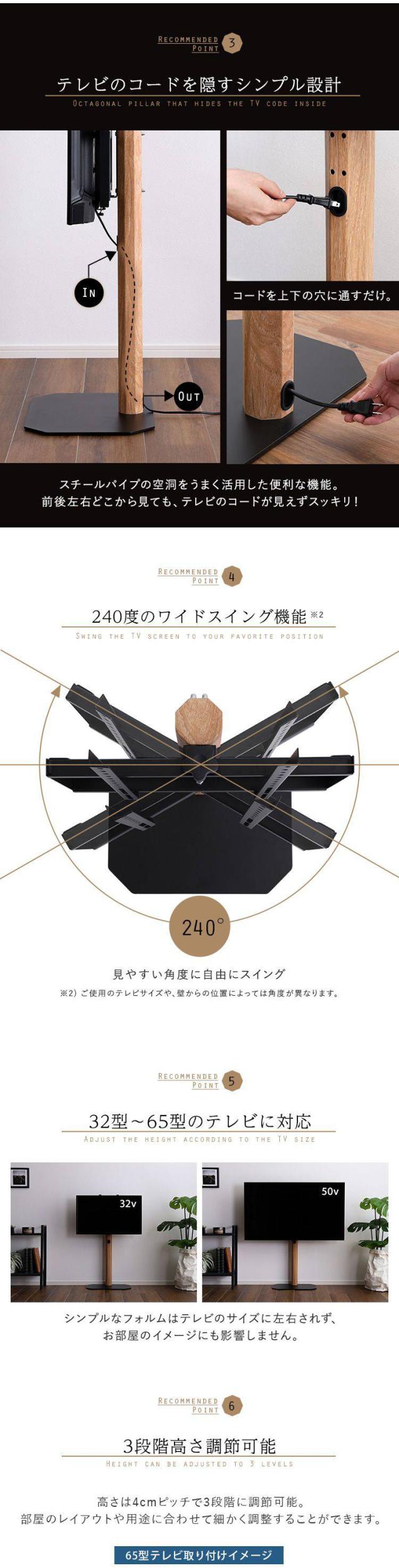 240度のスイングタイプで32〜65インチのテレビを取付できます。