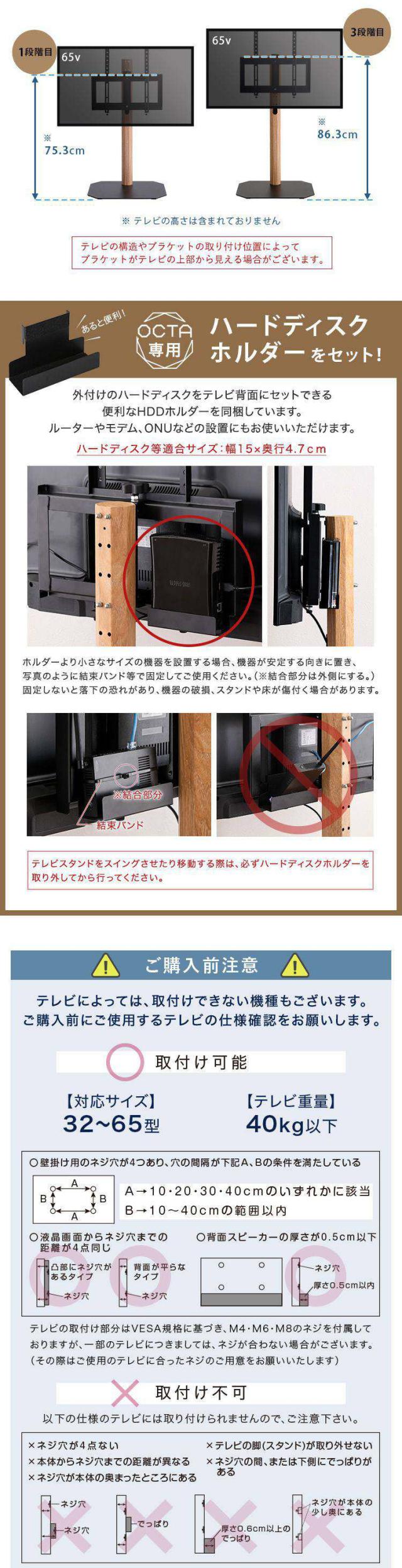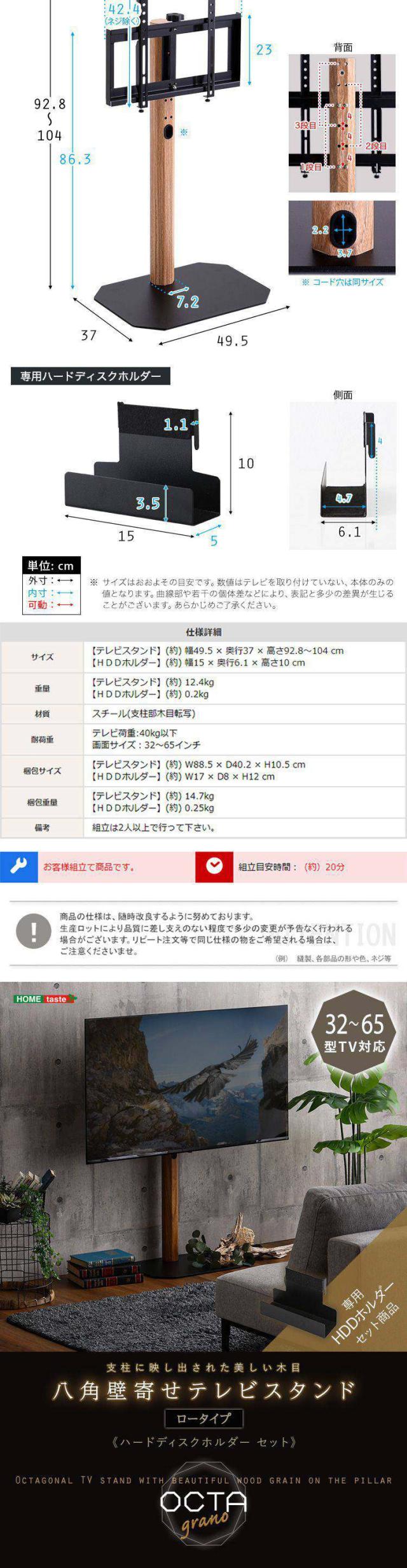スチール支柱に木目を転写したスタイリッシュなデザインの八角テレビスタンド ロータイプ ハードディスクホルダーセットです。